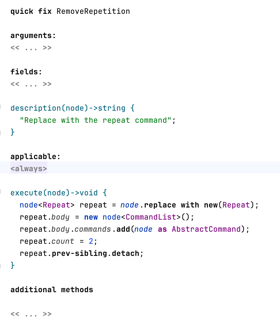A quick-fix must provide a description to represent it in the Intentions context menu, unless it is only ever referred to from callers with apply immediately set to true. A quick-fix may also declare fields, to hold reused values, and it can accept arguments from the caller. The applicable function controls the applicability of the quick-fix, the default value <always> guarantees unrestricted applicability.