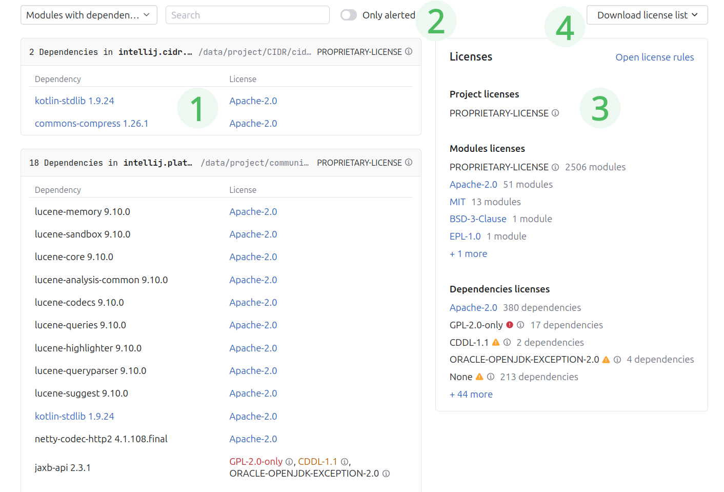 In the section, you can find the list of project, module and dependency licenses. Using , you can view the rules of license compatibility.