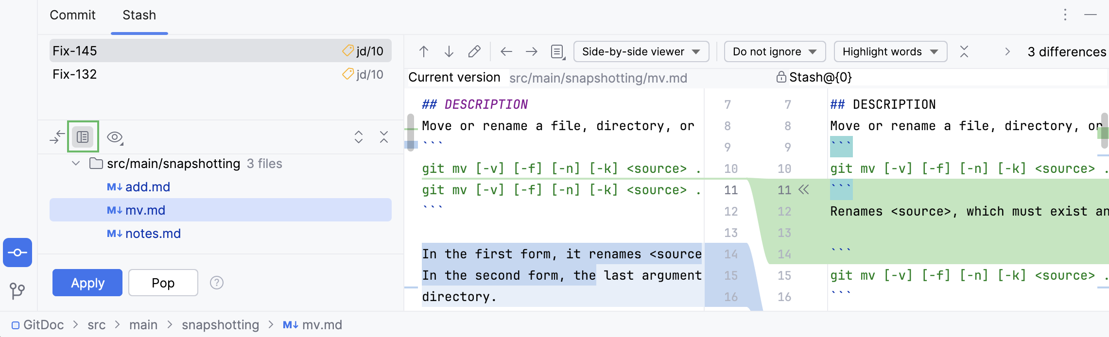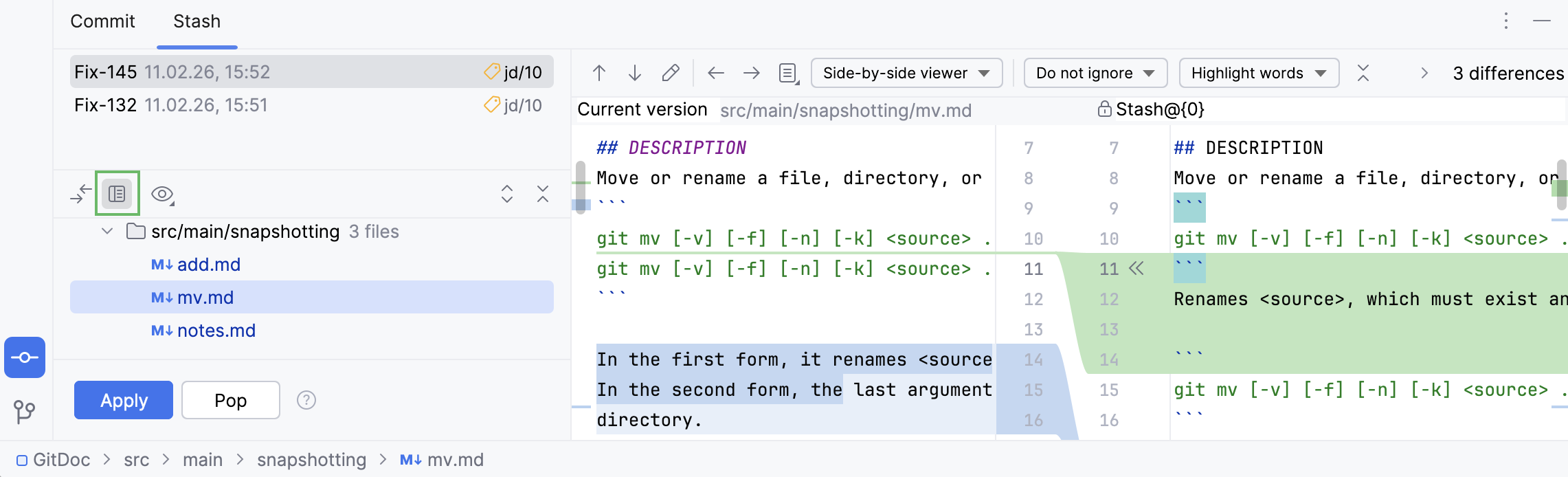To review the stashed changes and compare them to the current version of the code, double-click any file from the list to open the diff of stashes.