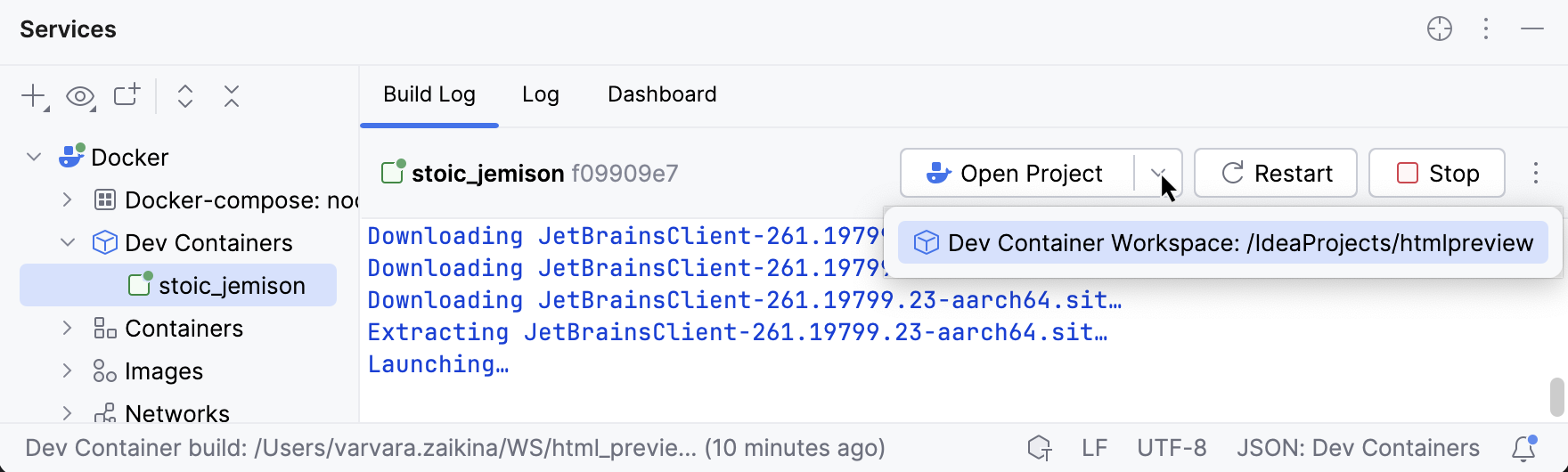 Show Dev Containers | Use this option to check a list of existing Dev Containers. You can see which ones are active and running, stop them, or restart them. ![]() |