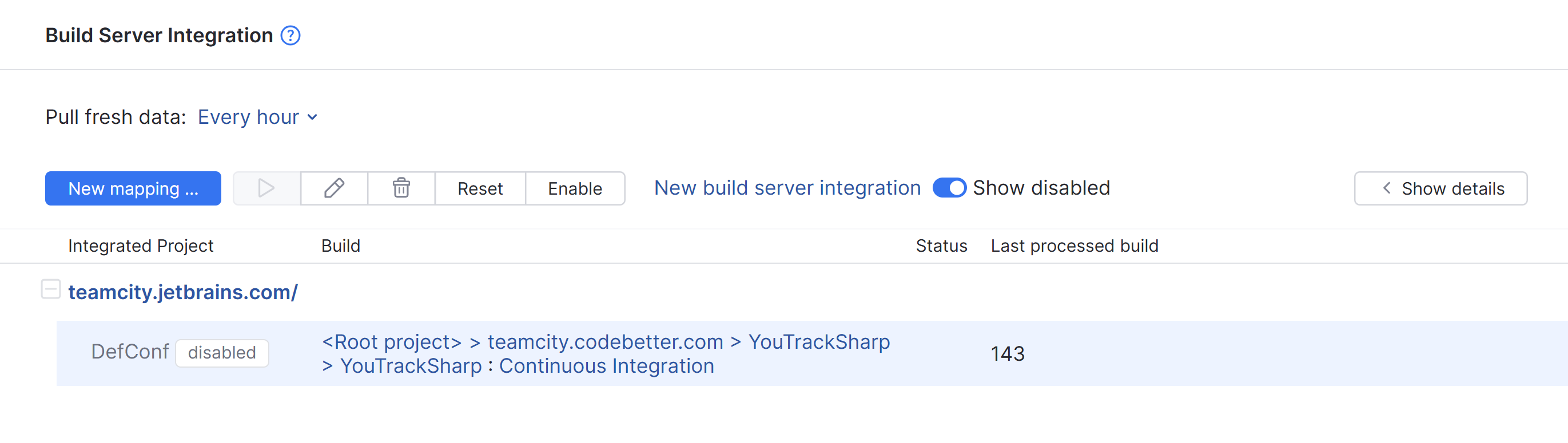 Run | Pulls fresh data from the build server for the selected project. Links to builds are added to issues in YouTrack based on the current integration settings. Commands in VCS commit messages are applied to the corresponding issues. Build numbers are added to issues according to the options that are defined in the mapping. The last processed build is updated in the corresponding column on the integration settings page. |