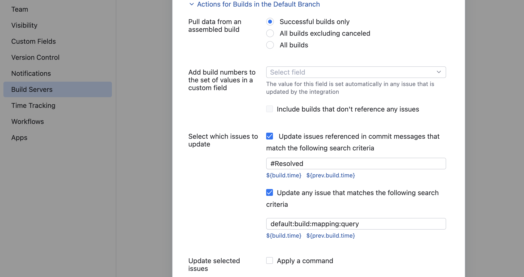 Click to expand the Actions for Builds in the Default Branch settings. These settings determine which builds in the default branch are processed by the integration and which issues are assigned build numbers.
