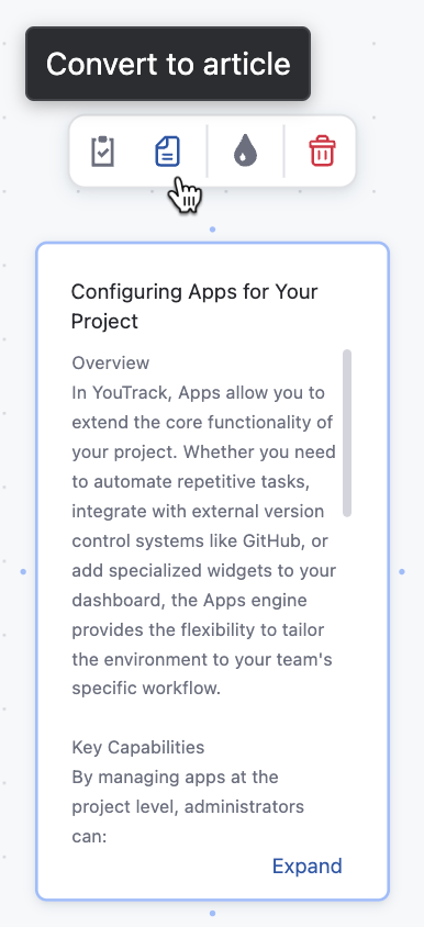 You can convert cards on the whiteboard into YouTrack articles, allowing you to transform notes or ideas into Knowledge Base documentation.