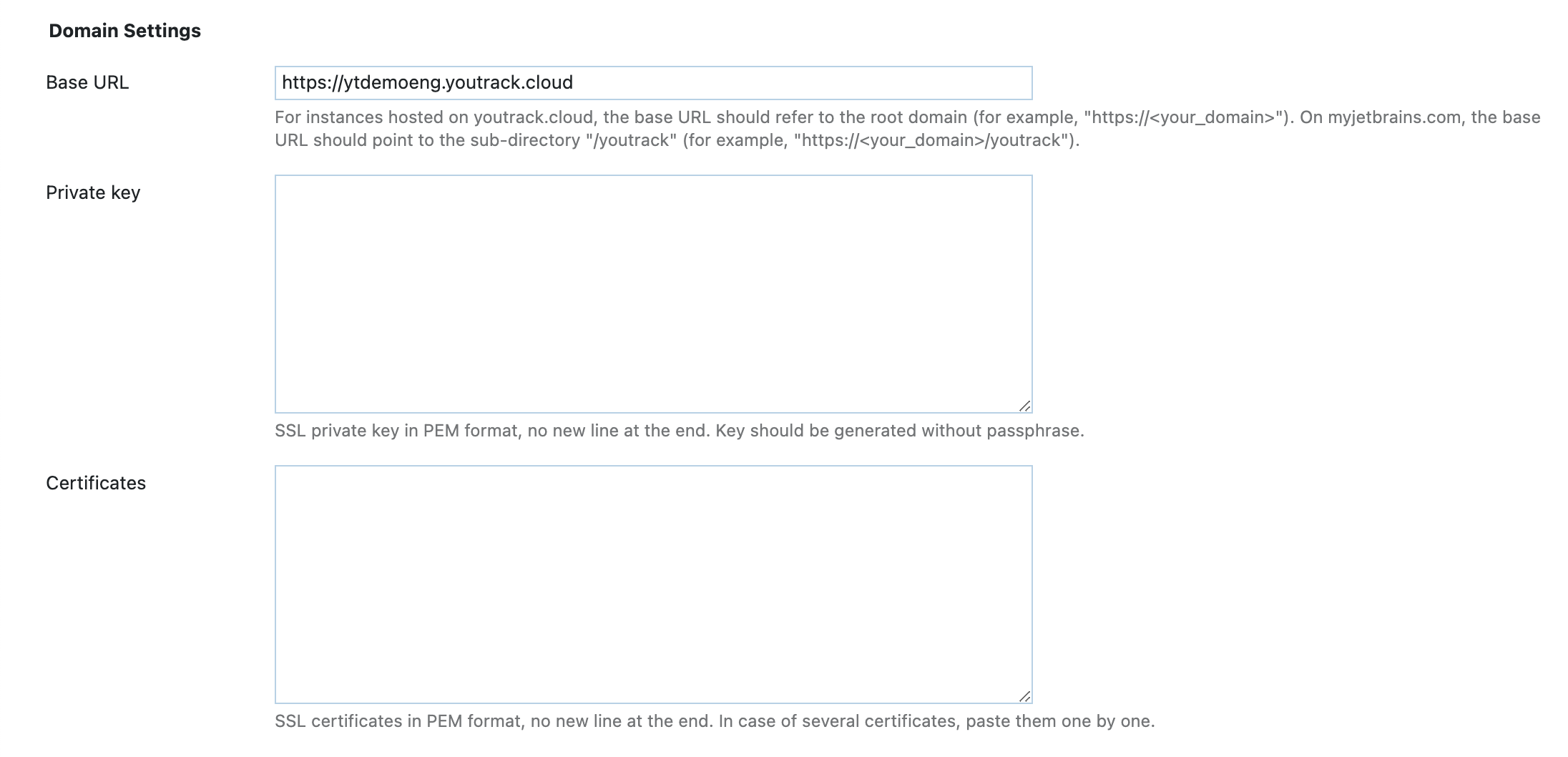 https://.Paste your SSL Private Key and Certificates in the corresponding fields. The key and certificates must be provided in PEM format. If you have several certificates, enter them sequentially with each certificate starting on a new line.