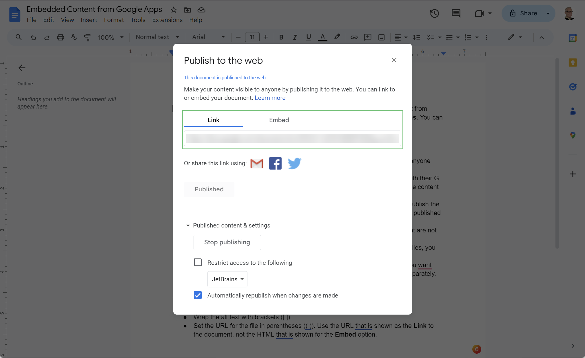 ( )). Use the URL shown as the Link to the document in the Publish to the web dialog, not the HTML that is shown for the Embed option. Don't use the link that you generate to share the file with other members of your organization — that won't work either.