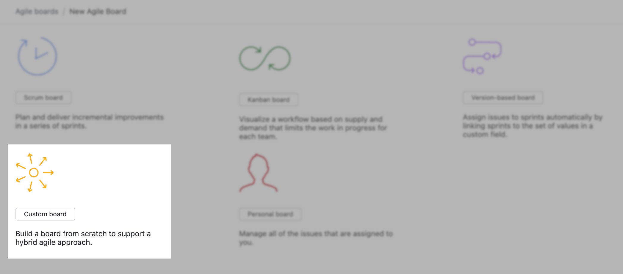 The board itself does not support an agile framework. There are no columns for issues that are Open, In Progress, or Done. It’s more like a bulletin board for managing personal tasks and getting an overview of the issues that other teams are planning and working on.