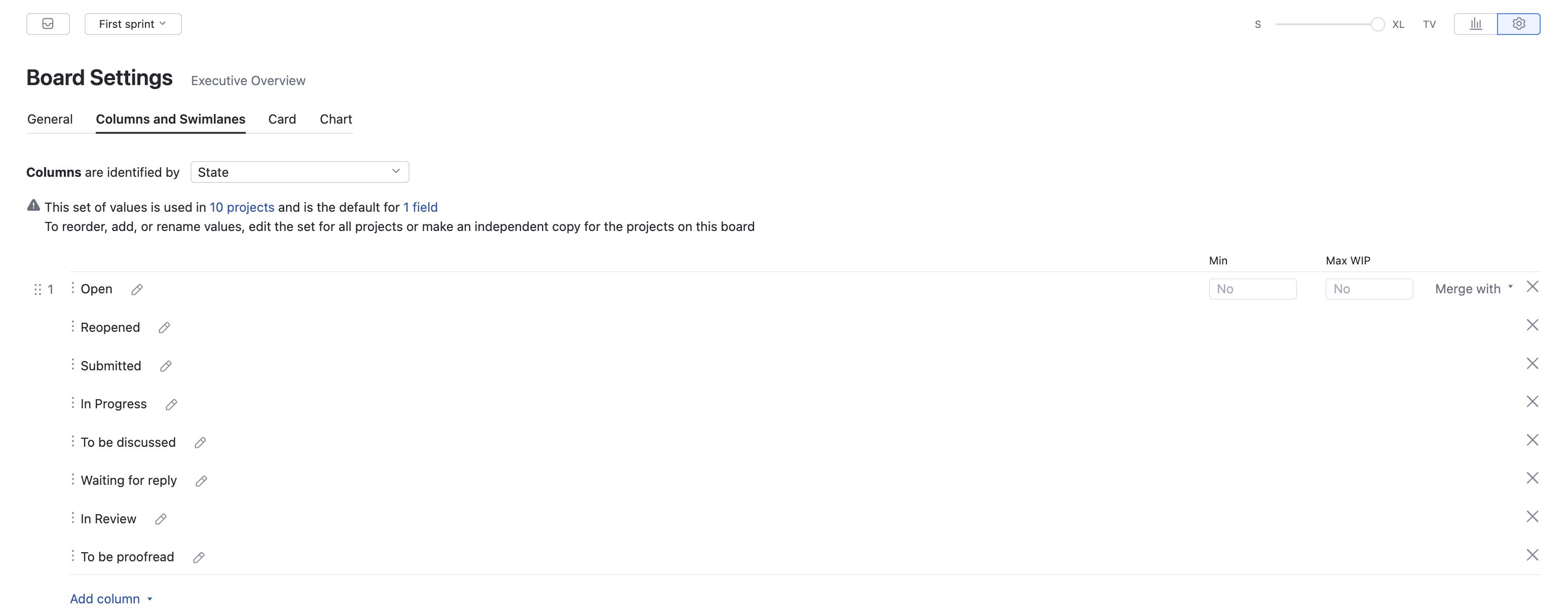 Use the Add column drop-down to add each unresolved state to the board.