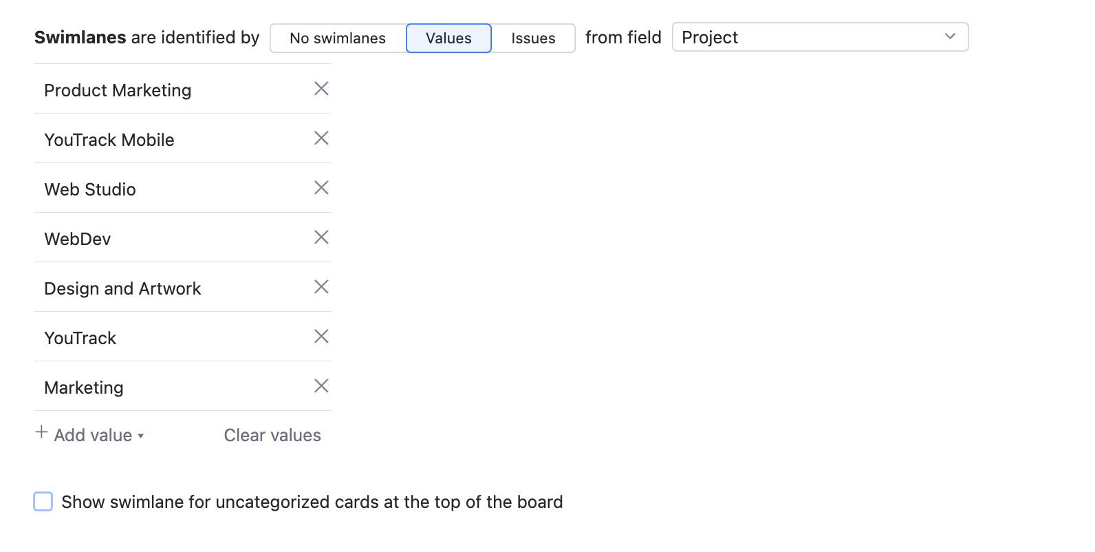 Use the Add value drop-down to add each project as a swimlane to the board.