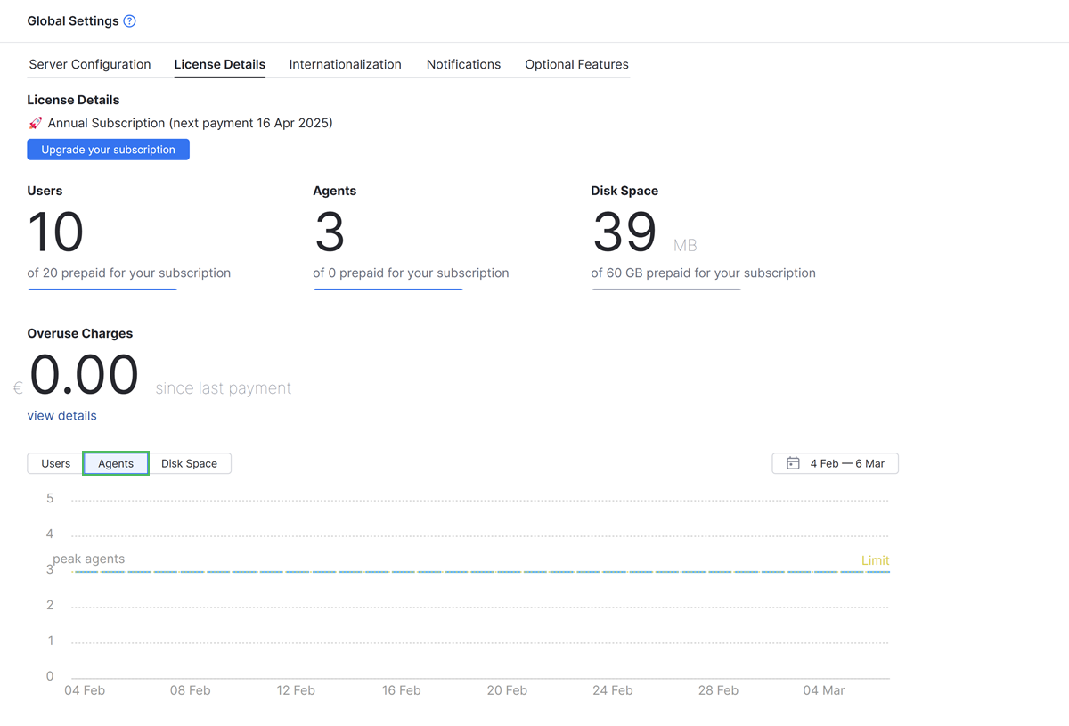 The peak agents bar indicates the current number of active user accounts that have been assigned an agent license.