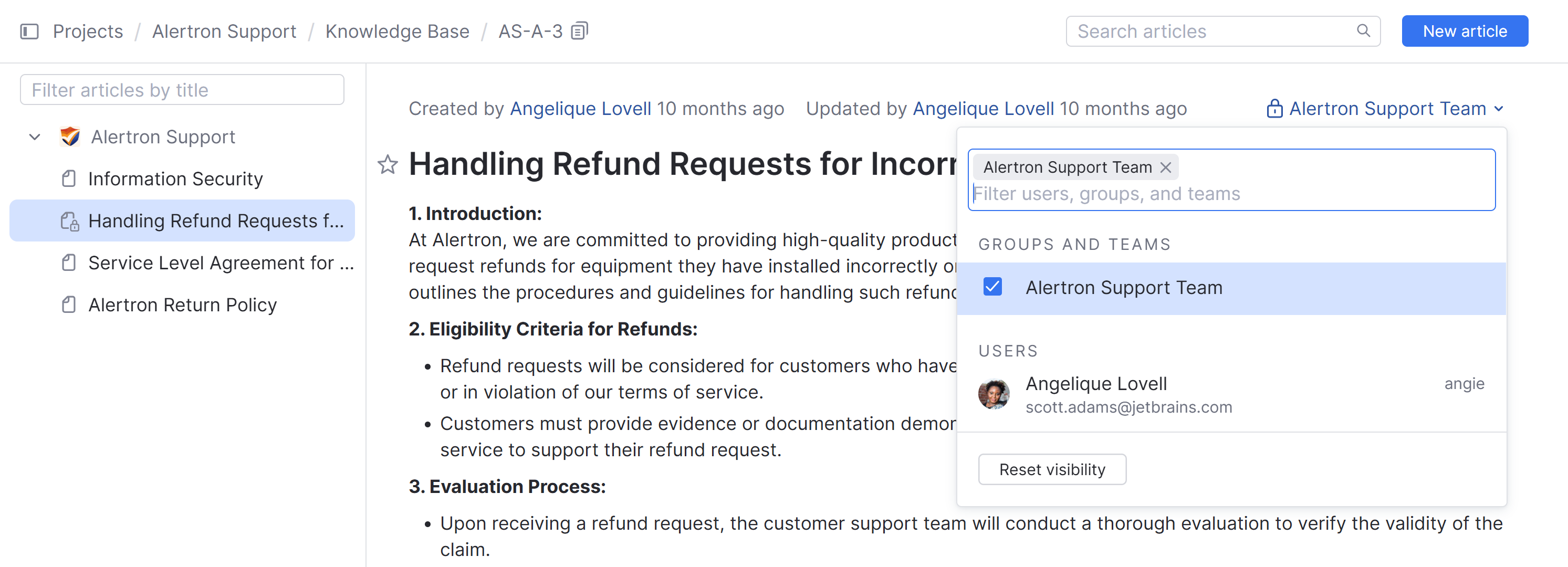 Your knowledge base can also support a mix of internal and public articles. This is done by using the visibility settings for articles, comments, and attachments.