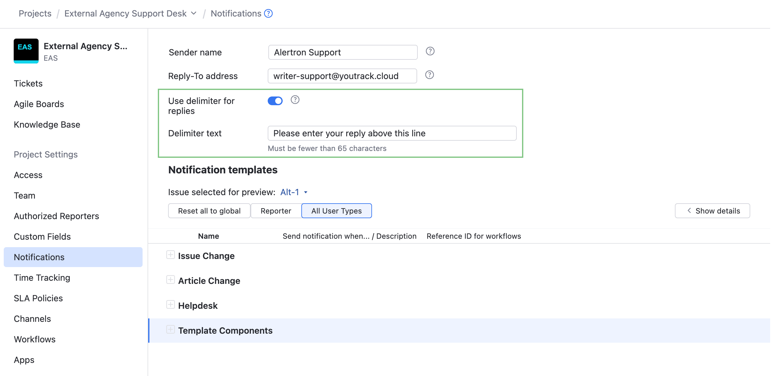 To make sure reporters recognize notifications about the tickets they submit to your helpdesk, it's important that you customize the sender name in your helpdesk project. YouTrack lets you override the default sender name or From address on a per-project basis.