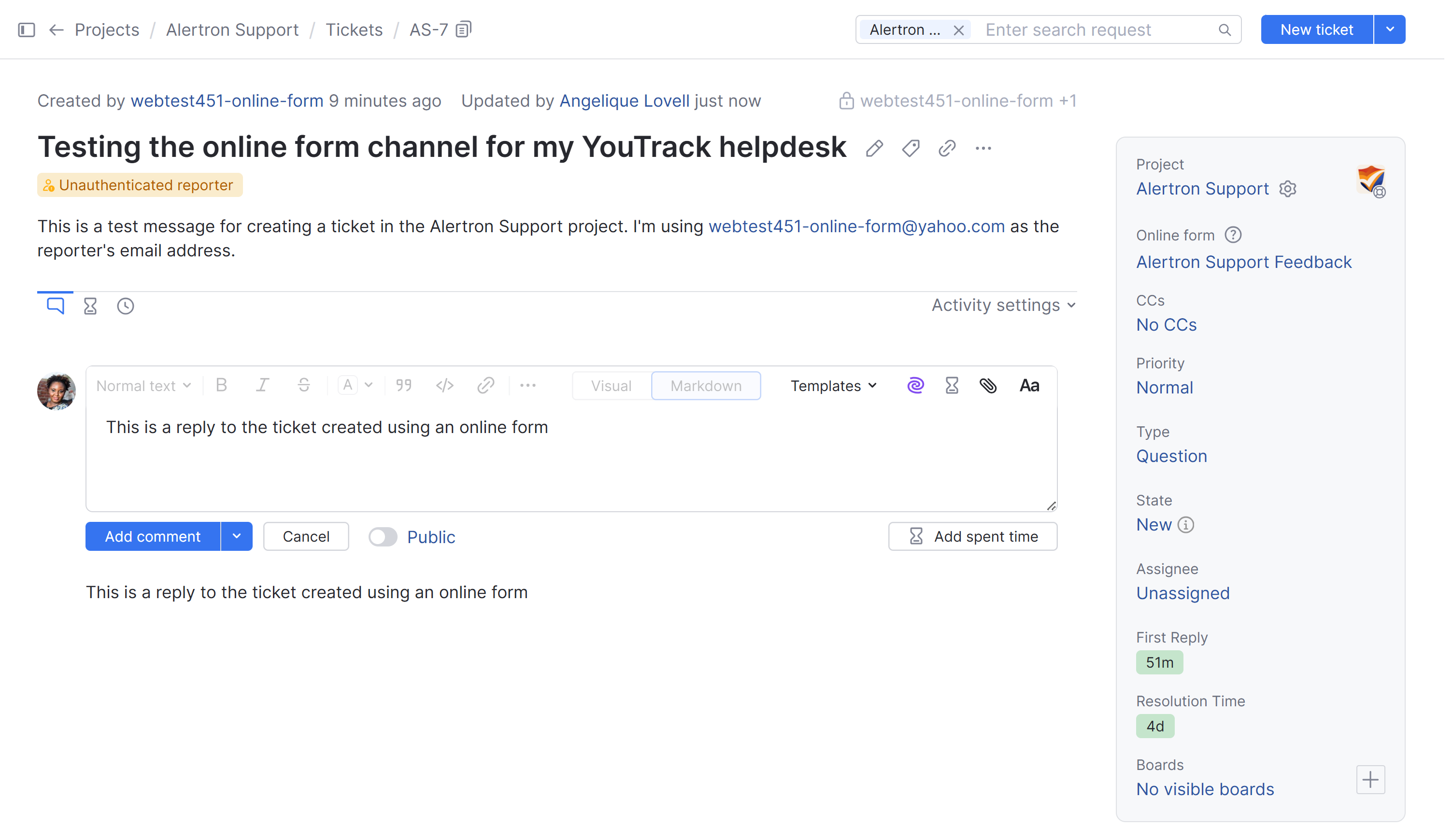 From here, you can continue testing by replying to each message from your test inbox. This lets you see how replies are added as comments to helpdesk tickets.