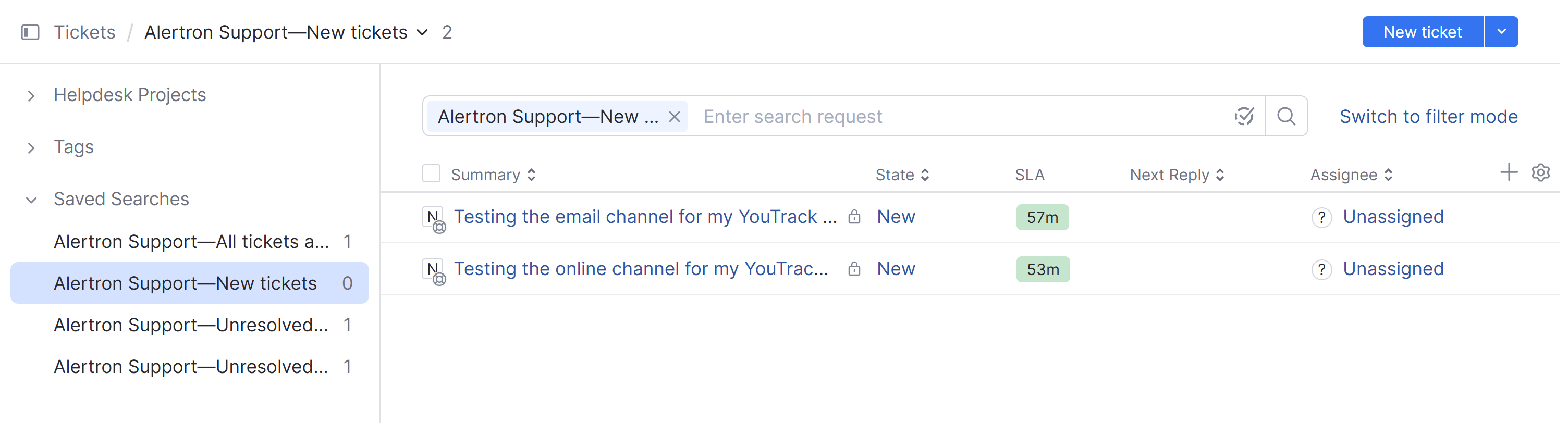 Next, open the Helpdesk page in YouTrack. Here, you'll find the tickets that were created from the messages sent to your helpdesk channels.