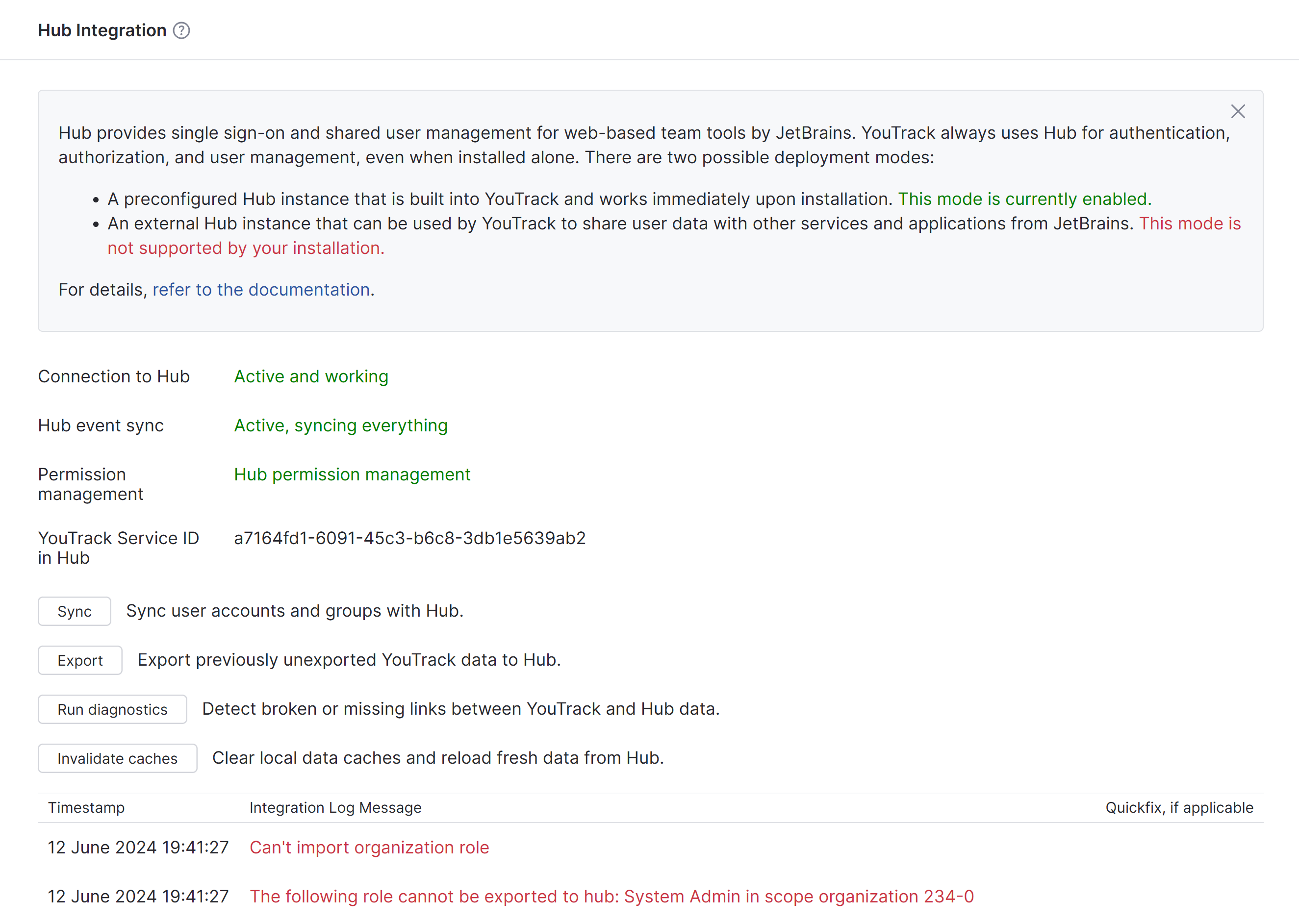 YouTrack Cloud instances are deployed with a built-in Hub service. The Hub Integration page provides an overview of this integration and its current status.