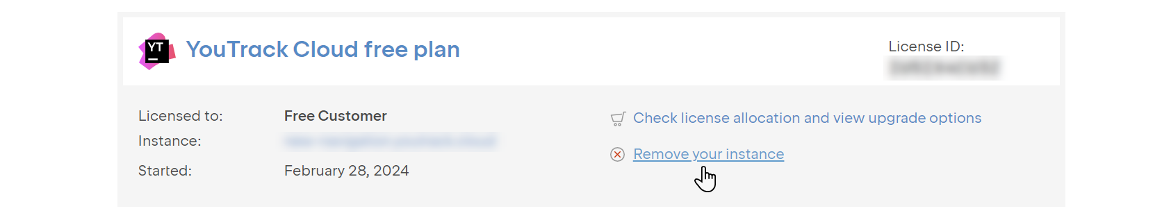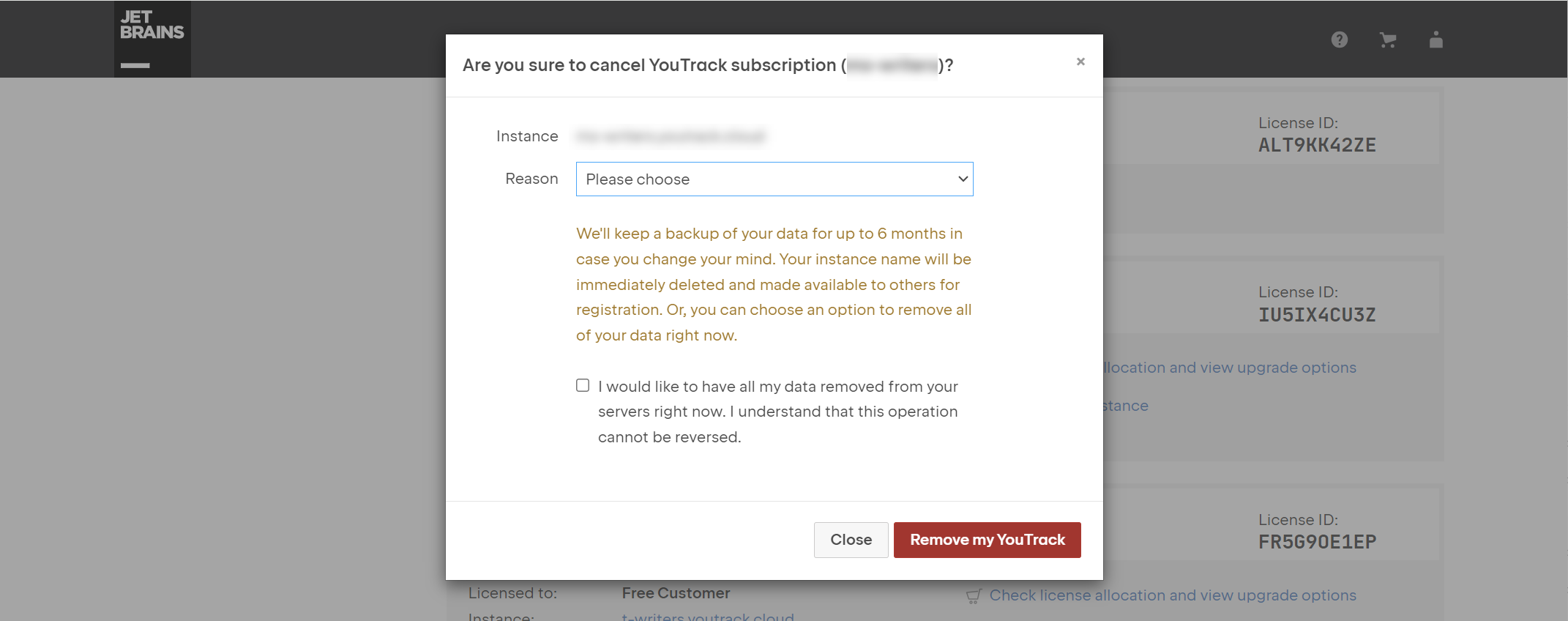 If you've been working with one of our free plans and no longer wish to continue working with YouTrack, you can also request that we remove the instance and delete its data.