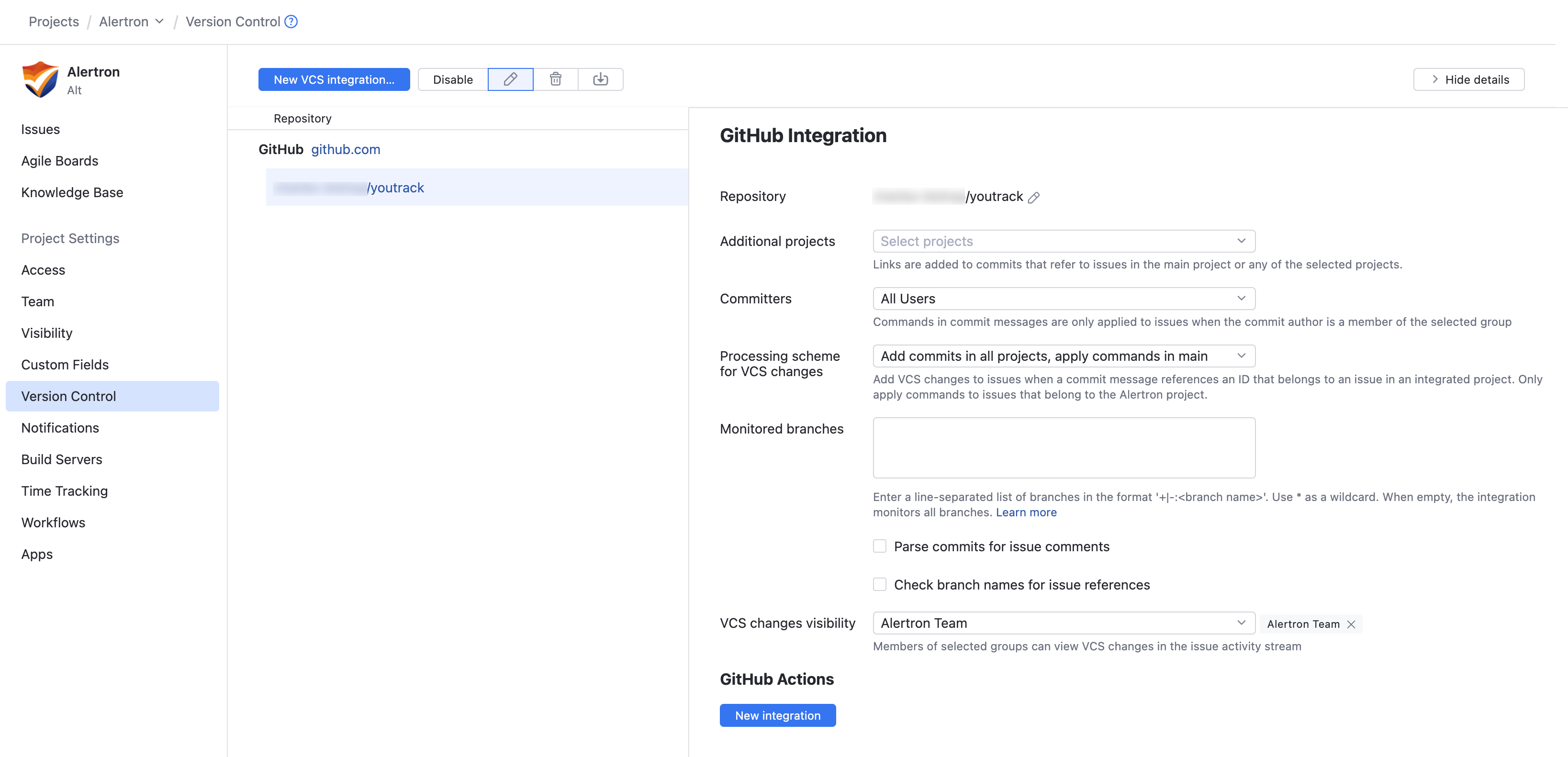 The integration with GitHub Actions becomes possible when you've established a connection between YouTrack and a VCS repository that is hosted on github.com. To learn how to integrate YouTrack projects with GitHub, see Integrate with GitHub.