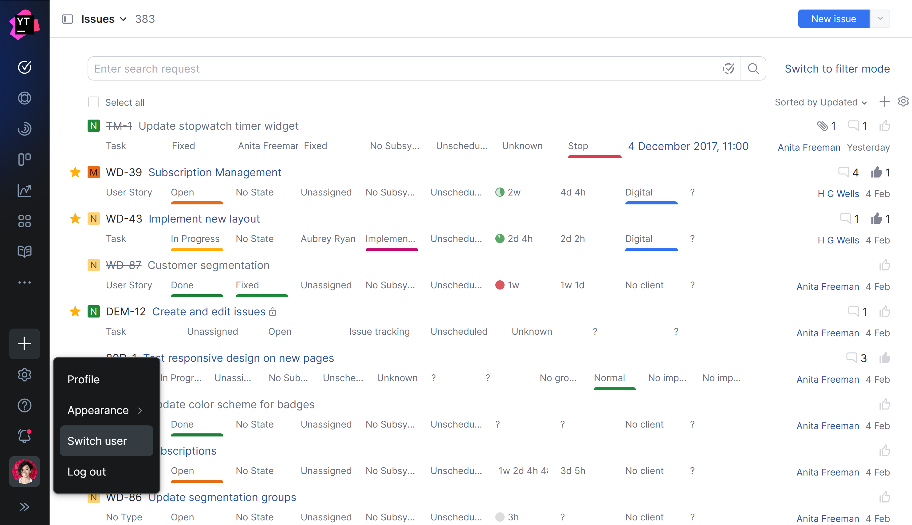 If you have more than one YouTrack account, you can switch between accounts without signing out and back in again.