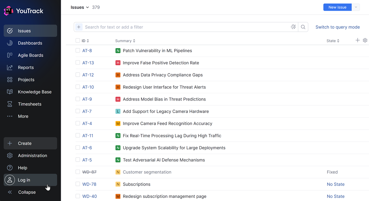 • When you log out of YouTrack, you are logged out of the application in all browser tabs.