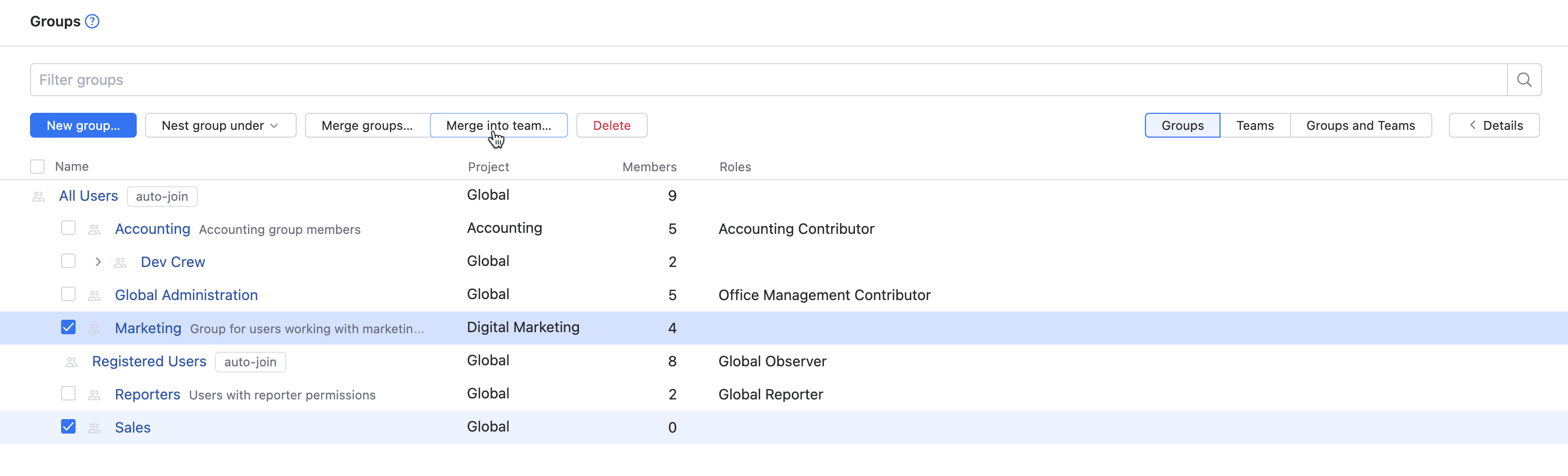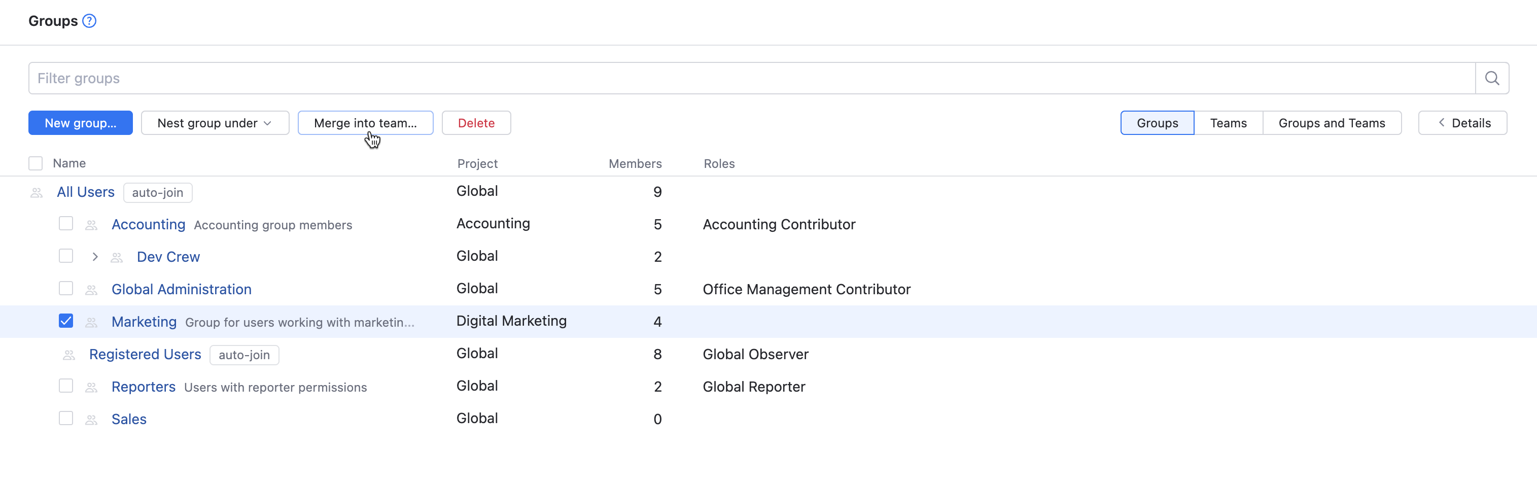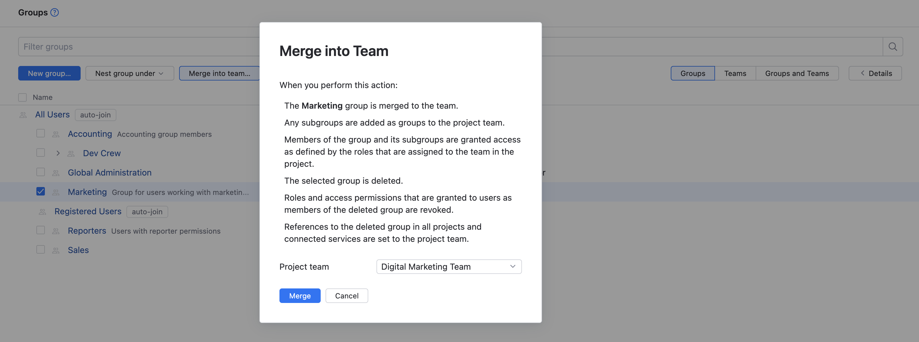 Note that you can perform this action for multiple groups at once. When you select multiple groups, the Merge into team option is available from the Merge groups drop-down menu.