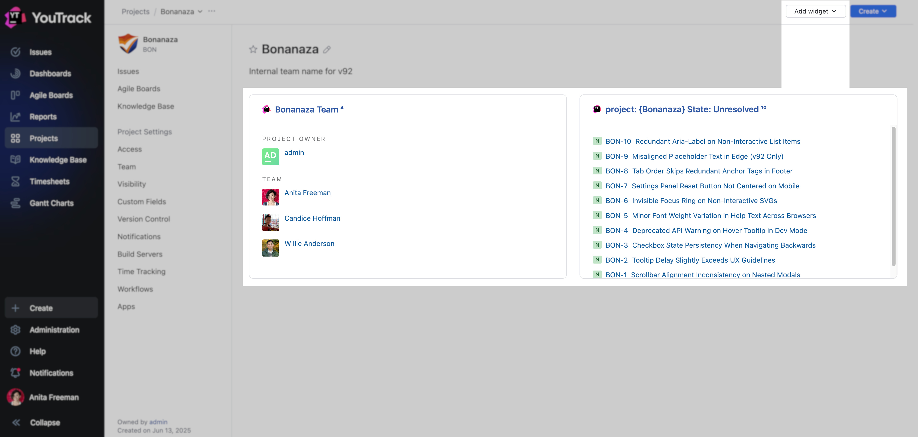The project overview page supports all the widgets that are available on a dashboard, including custom widgets that have been installed in YouTrack.