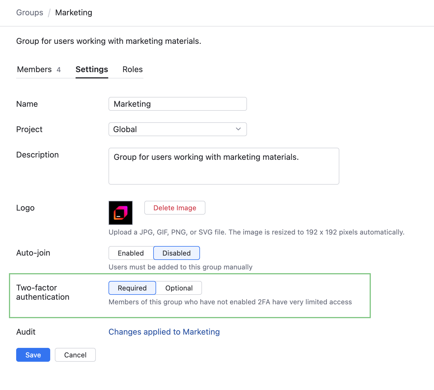 The Two-factor authentication setting in the group profile lets administrators require two-factor authentication (2FA) for any group in YouTrack.