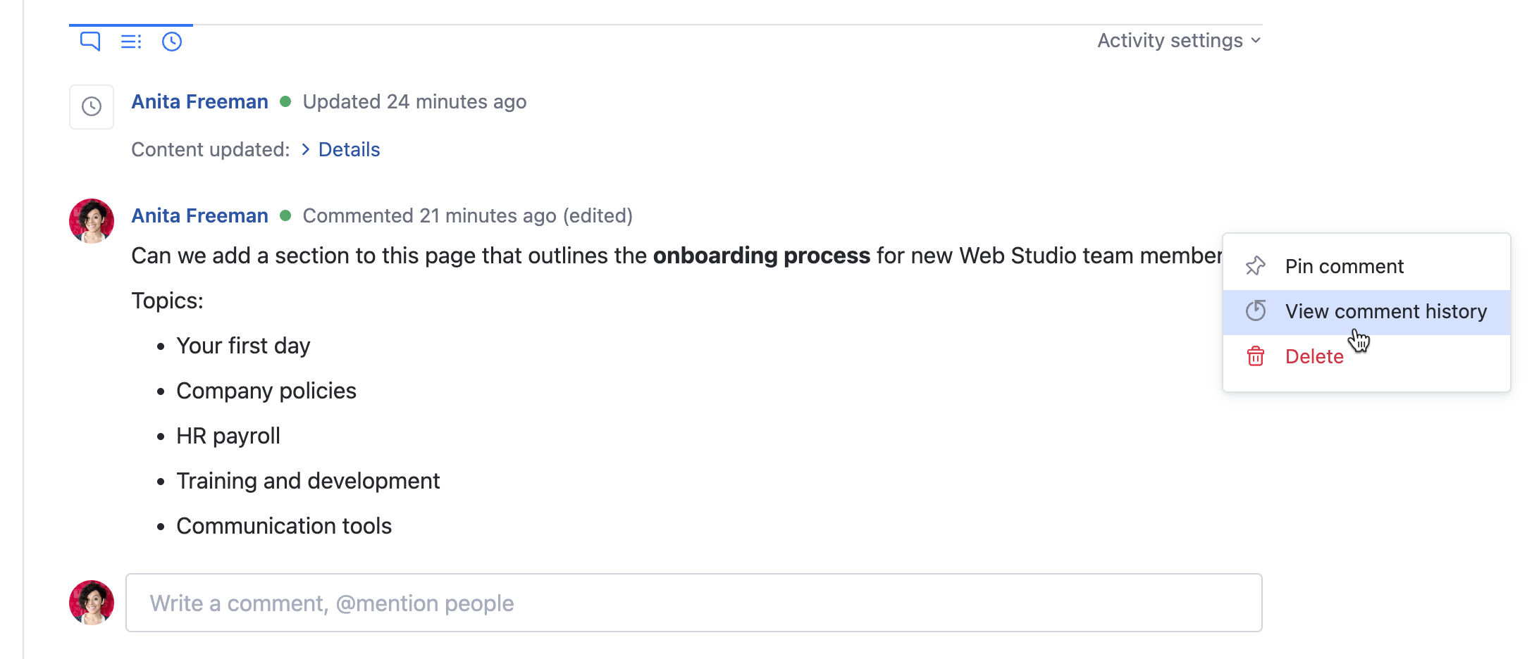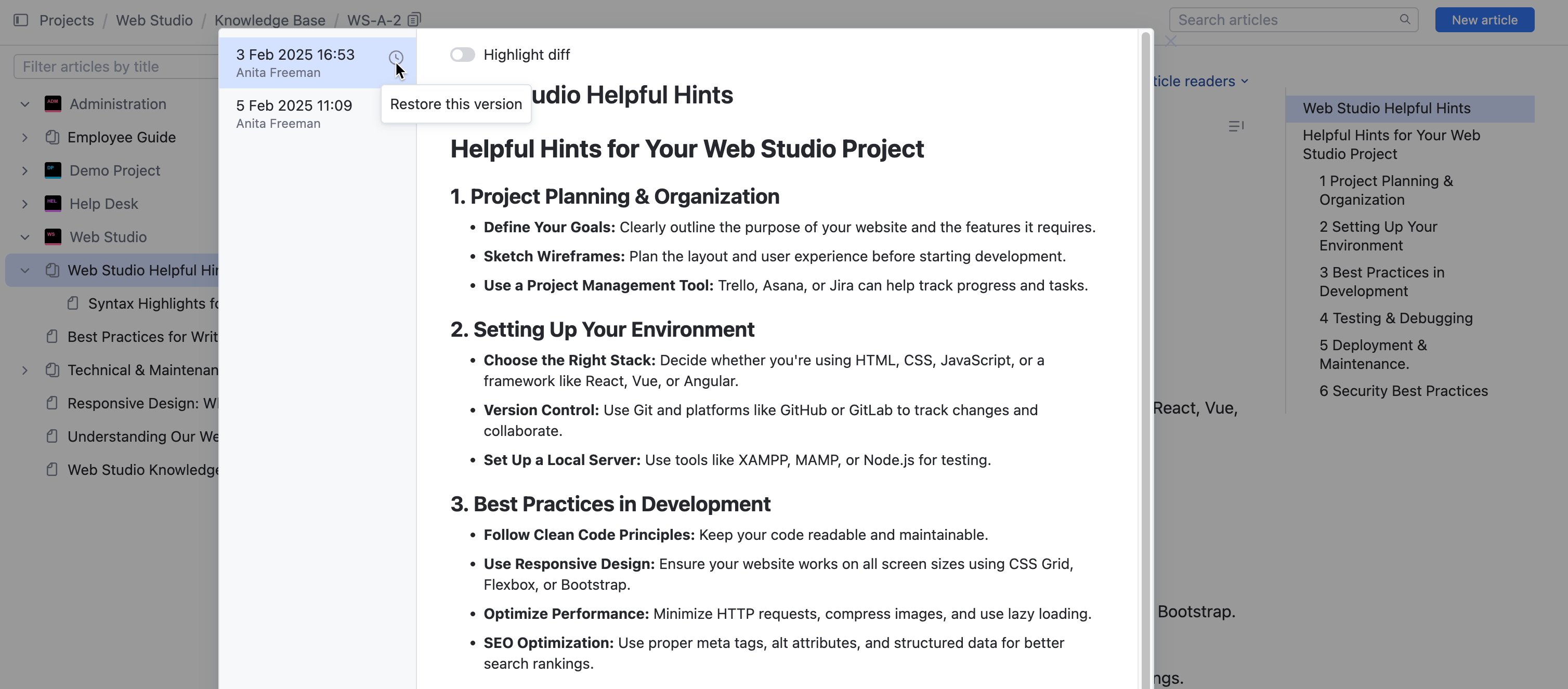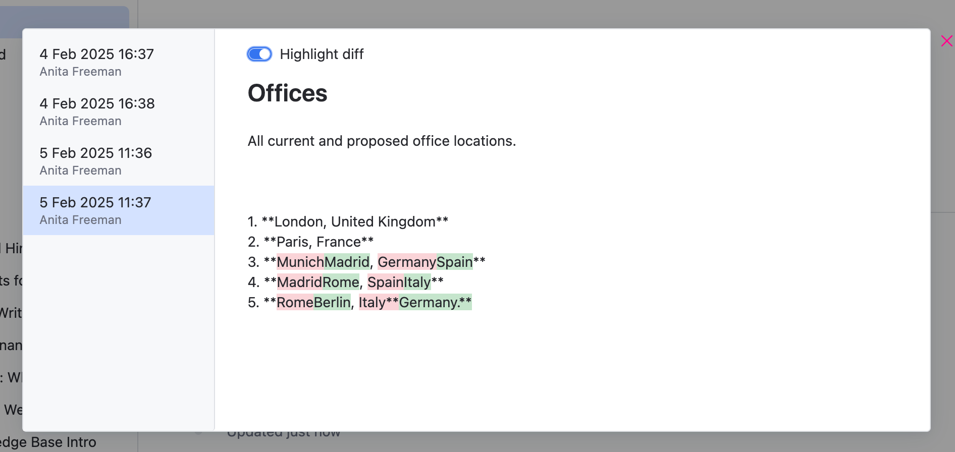 • If you're referring to an article that you've read before, you can quickly locate the changes and see when they were applied. For example, if your team has a policy for submitting expense reports, it can help you learn what you should do differently the next time you submit an invoice for repayment.