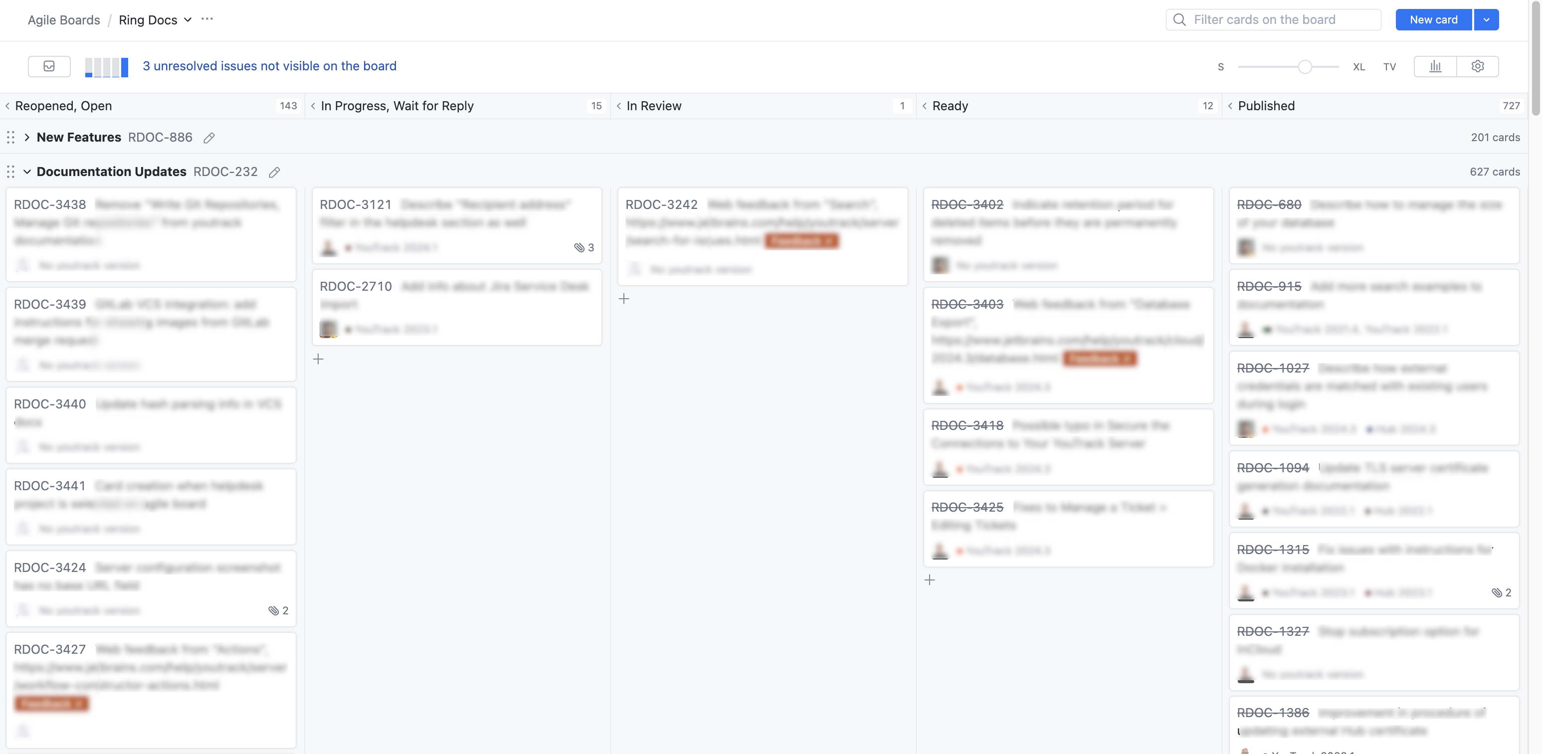 • The YouTrack developers use a Scrum framework to deliver updates on a continuous basis. However, the actual delivery of new functionality is typically scheduled for one of our quarterly releases. We use these release cycles as the time box for updating the documentation, so the sprints on this board include a collection of updates to be published for the release.