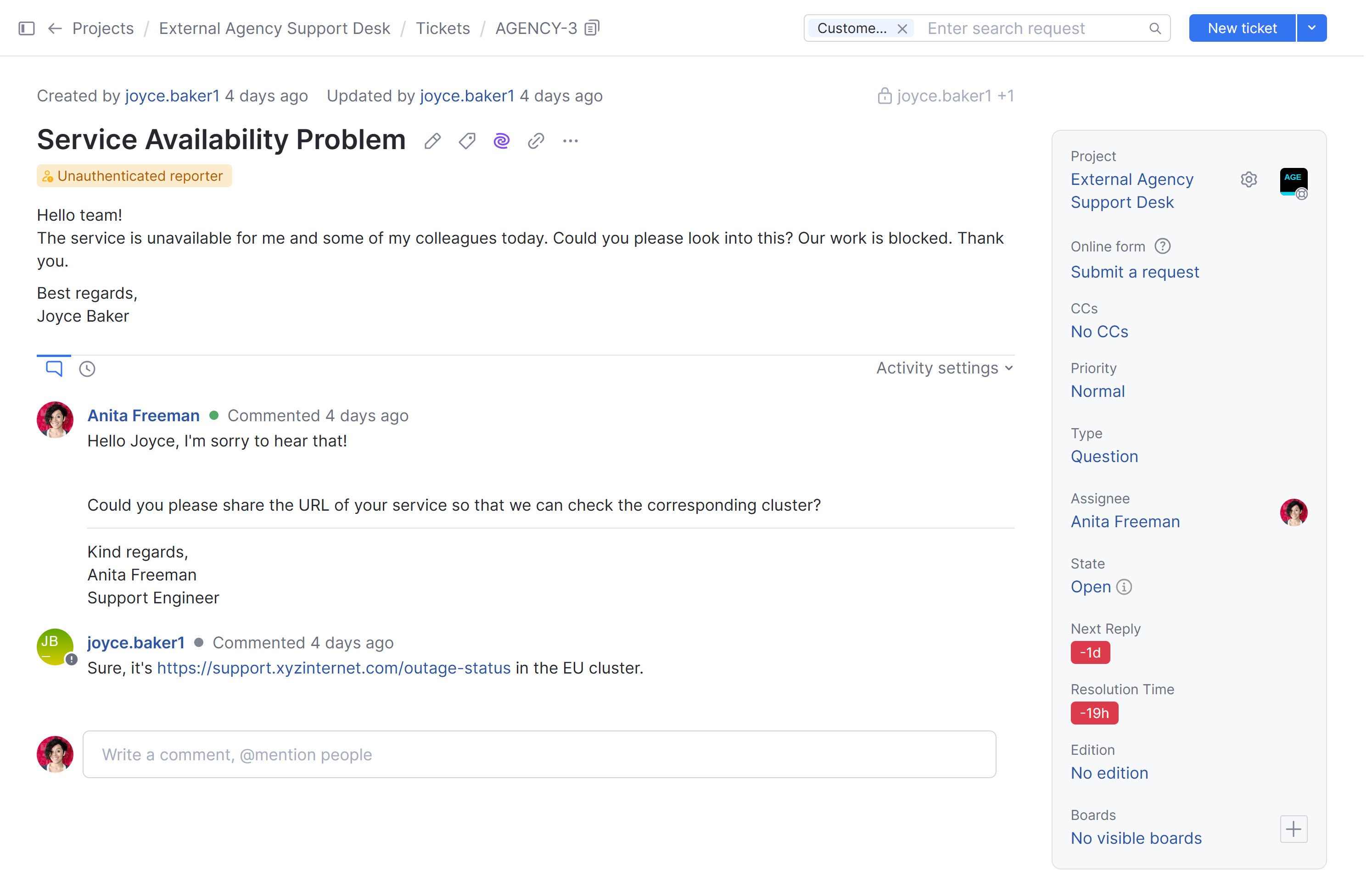 • An agent will provide an initial reply to the ticket within an hour after the ticket is reported.