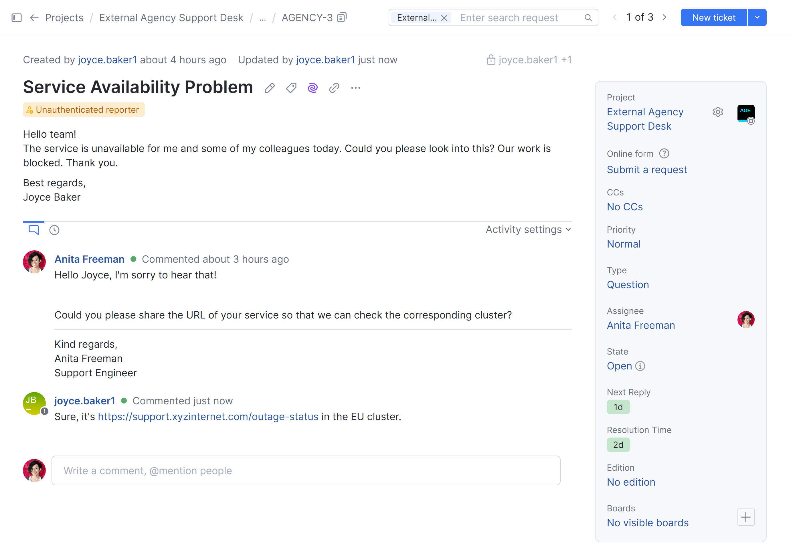 • An agent will provide an initial reply to the ticket within 3 hours after the ticket is reported.