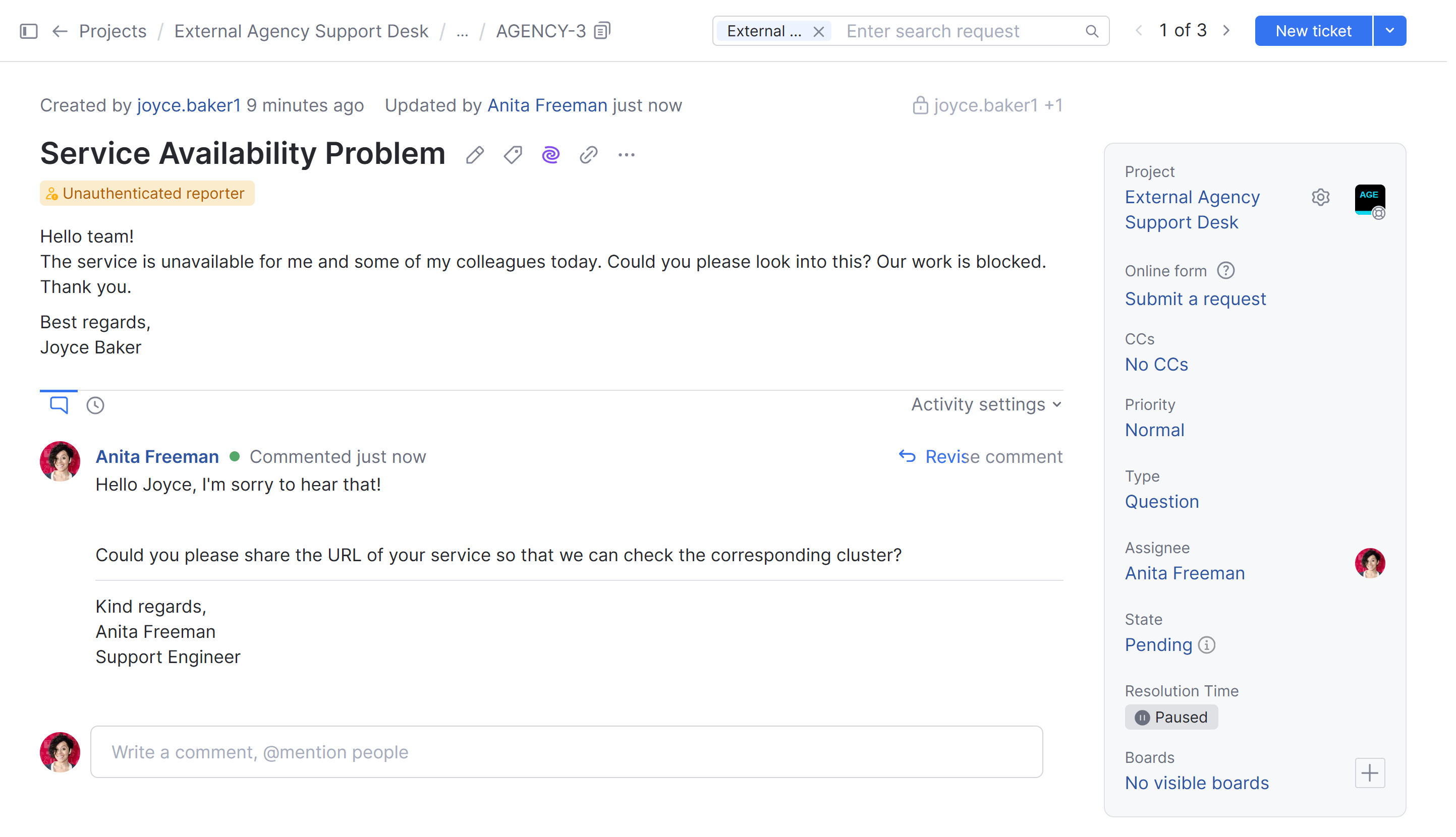 • In one hour, the helpdesk agent responds to the customer and asks for more details. The agent sets the state of the ticket to Pending.