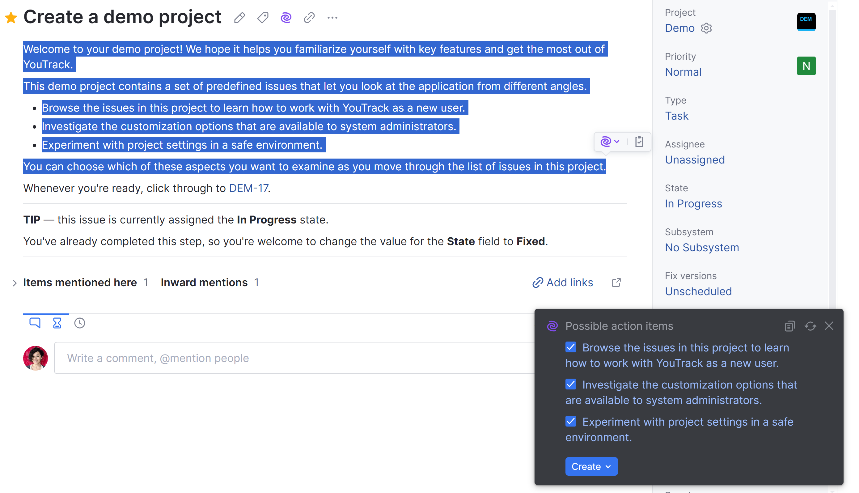 You can select text in an issue, article, or comment and have JetBrains AI assistant generate a list of action items found in the selected text. These generated action items can be selected for transformation into new issues.