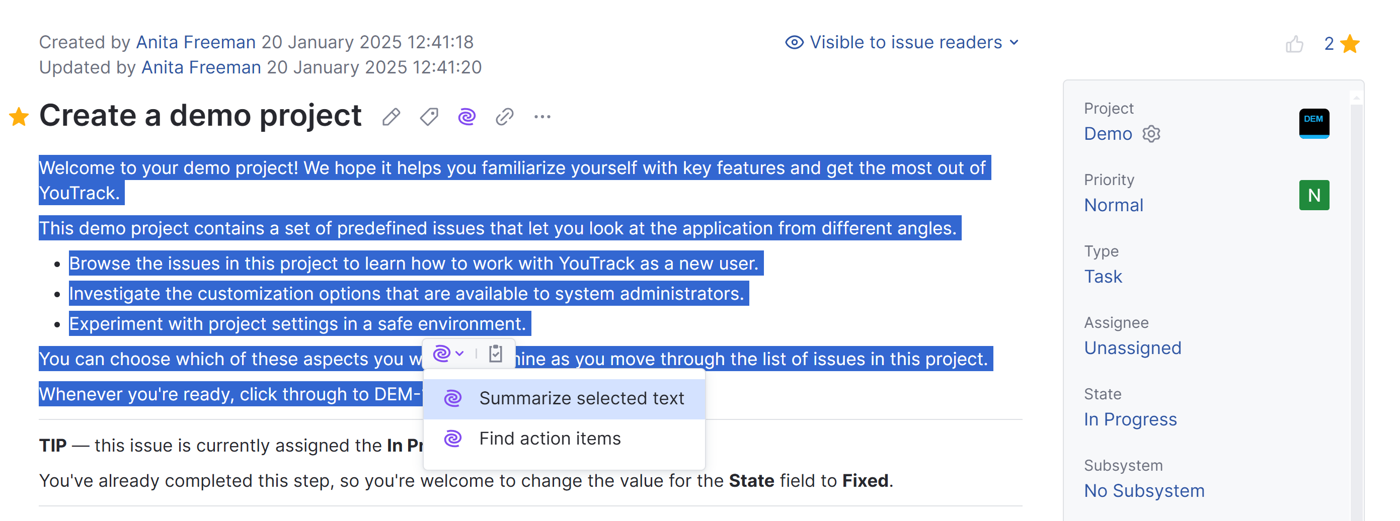 You can select text in an issue, article, or comment and have JetBrains AI assistant generate a short summary of the selected text.