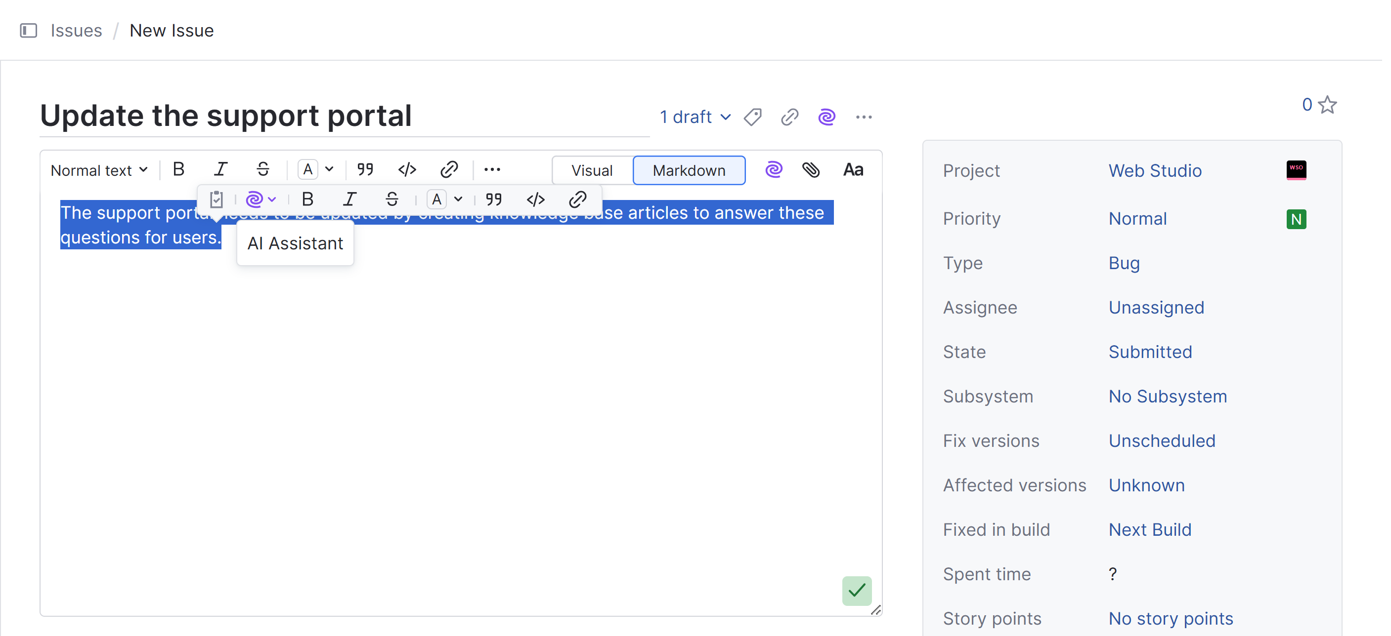You can select already submitted text created with a text editor or select text while the text editor is active. When the text editor is inactive, the toolbar has Create an issue and AI assistant options. When the text editor is active, the toolbar also offers text formatting options.