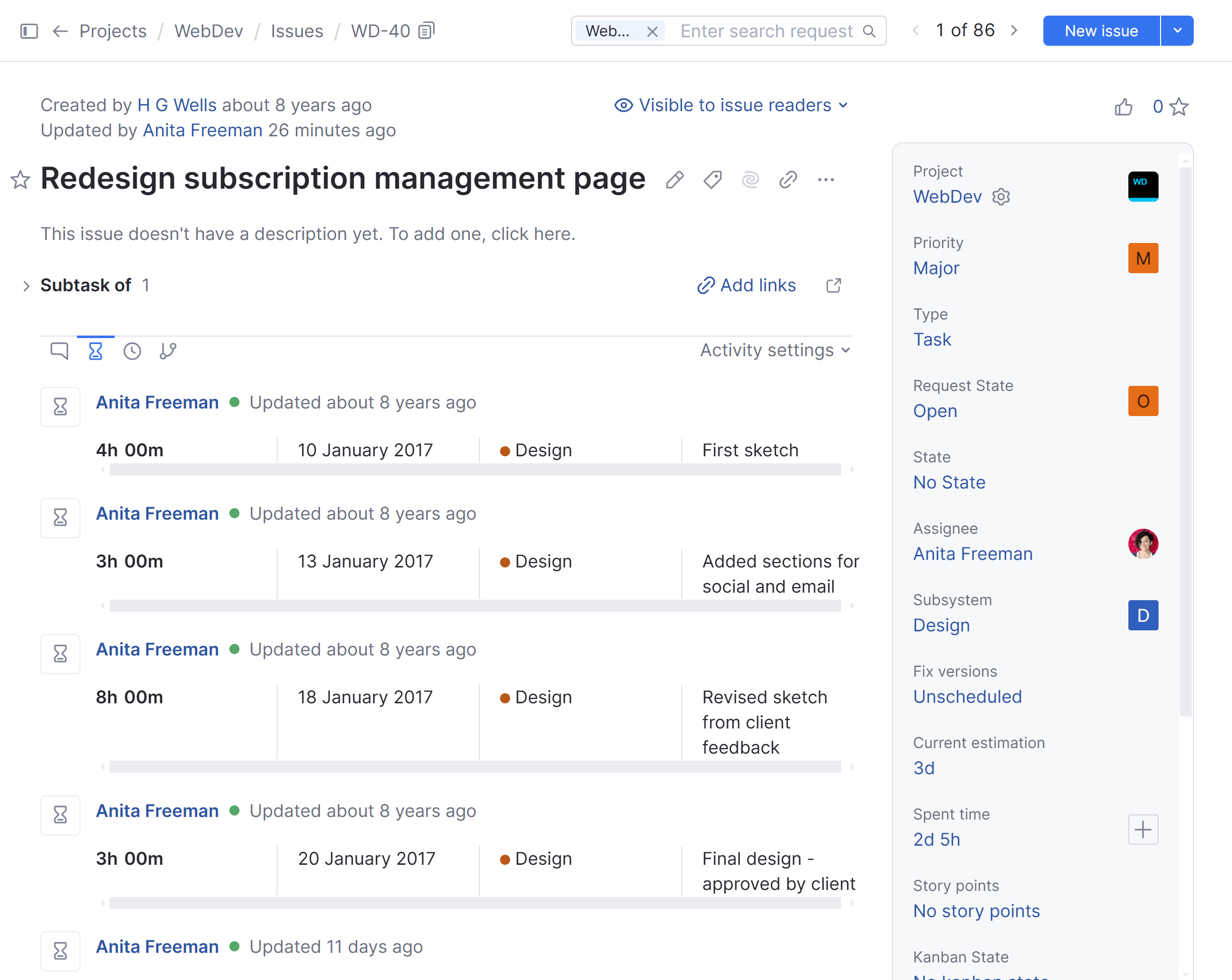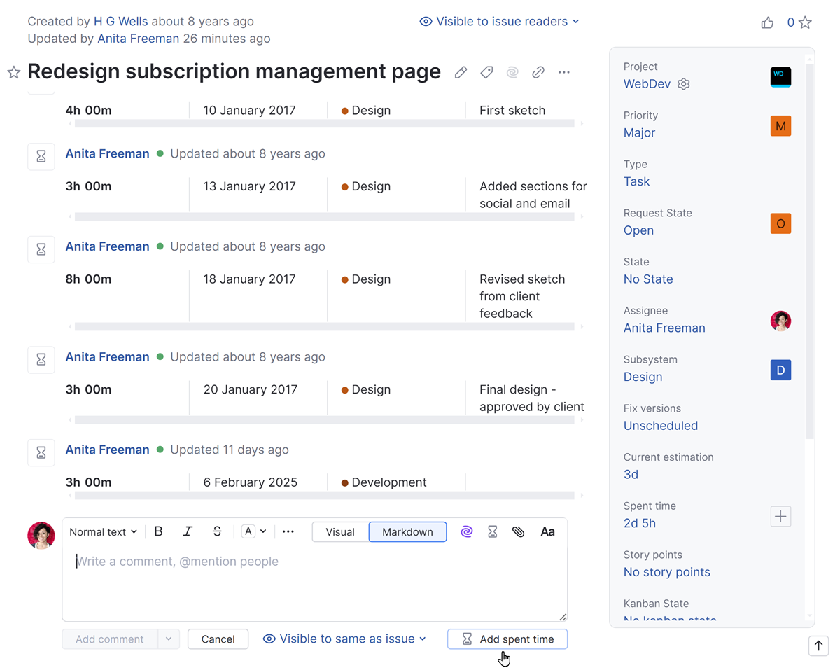 YouTrack associates work items with a specific issue. In other words, you can log multiple work items that represent work related to the same issue. In single issue view, YouTrack shows a list of work items that have been added to an issue in the activity stream. The filter that shows spent time is only visible when time tracking is enabled in the project.