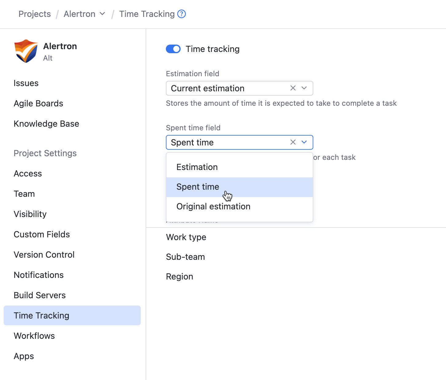 If your project already includes fields for Estimation and Spent Time that use the period field type, YouTrack uses these fields by default for time tracking. Otherwise, YouTrack automatically adds these fields to your project when you edit these settings.