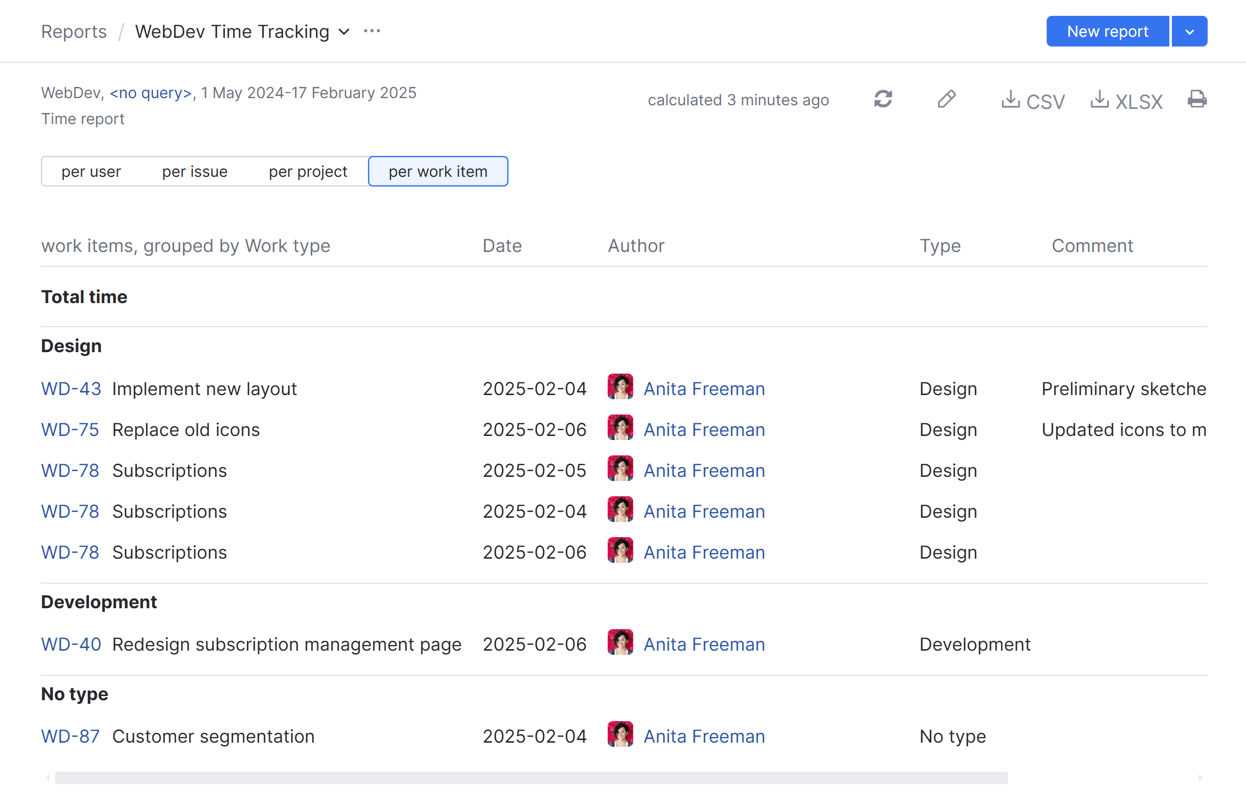 If you remove the grouping by work type, you can still view the total time spent on different types of activities, such as development, testing, documentation, or graphic design. To see the detailed report, enable the Show work types option next to the controls for switching between different views of the report.
