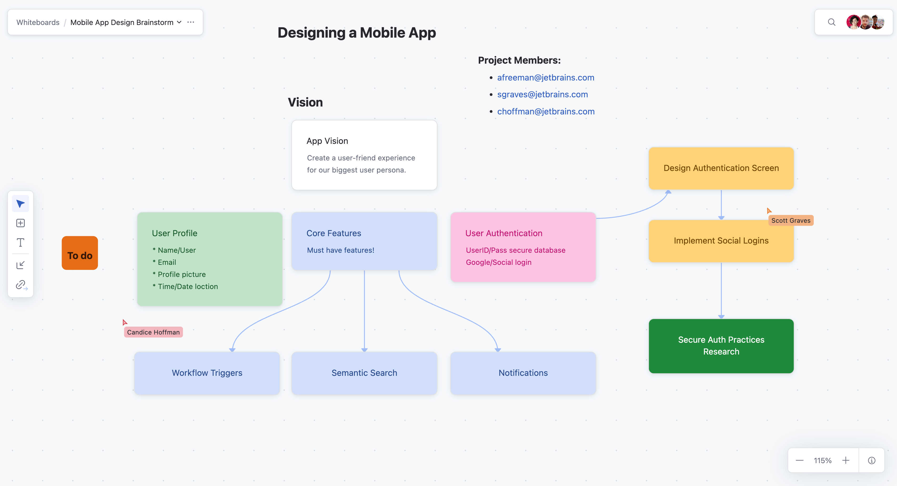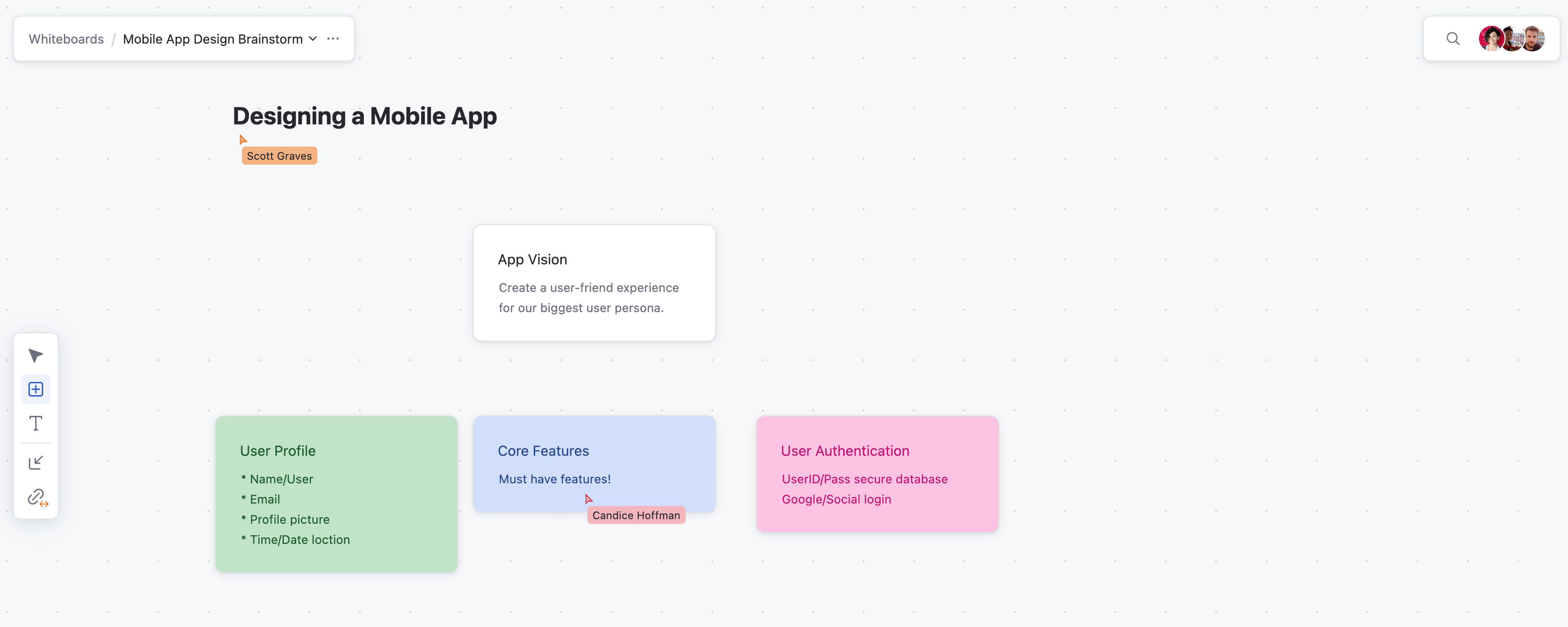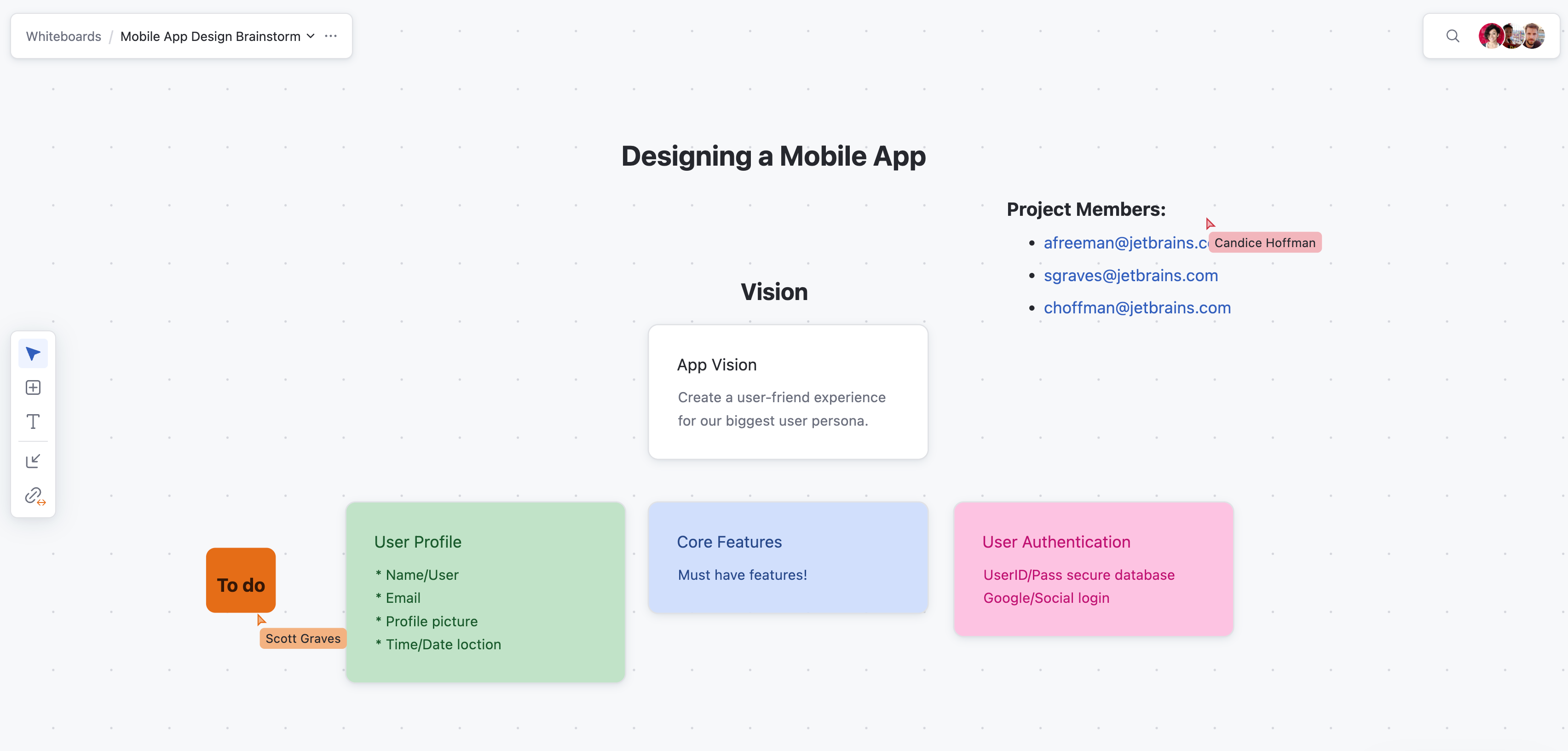 • Set up a whiteboard by opening a new whiteboard and name it something like "<Feature> Design Brainstorm."