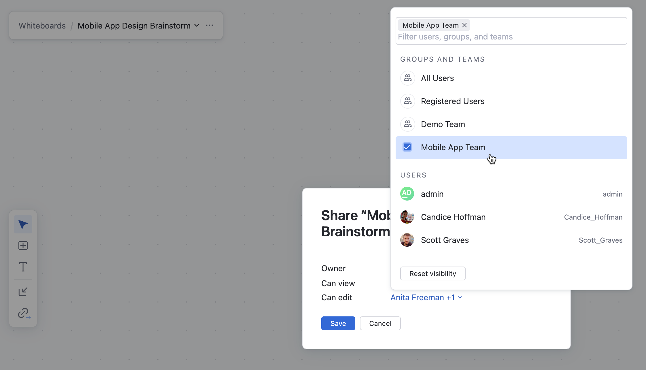 Select Share and add brainstorming participants that can view and edit the whiteboard.