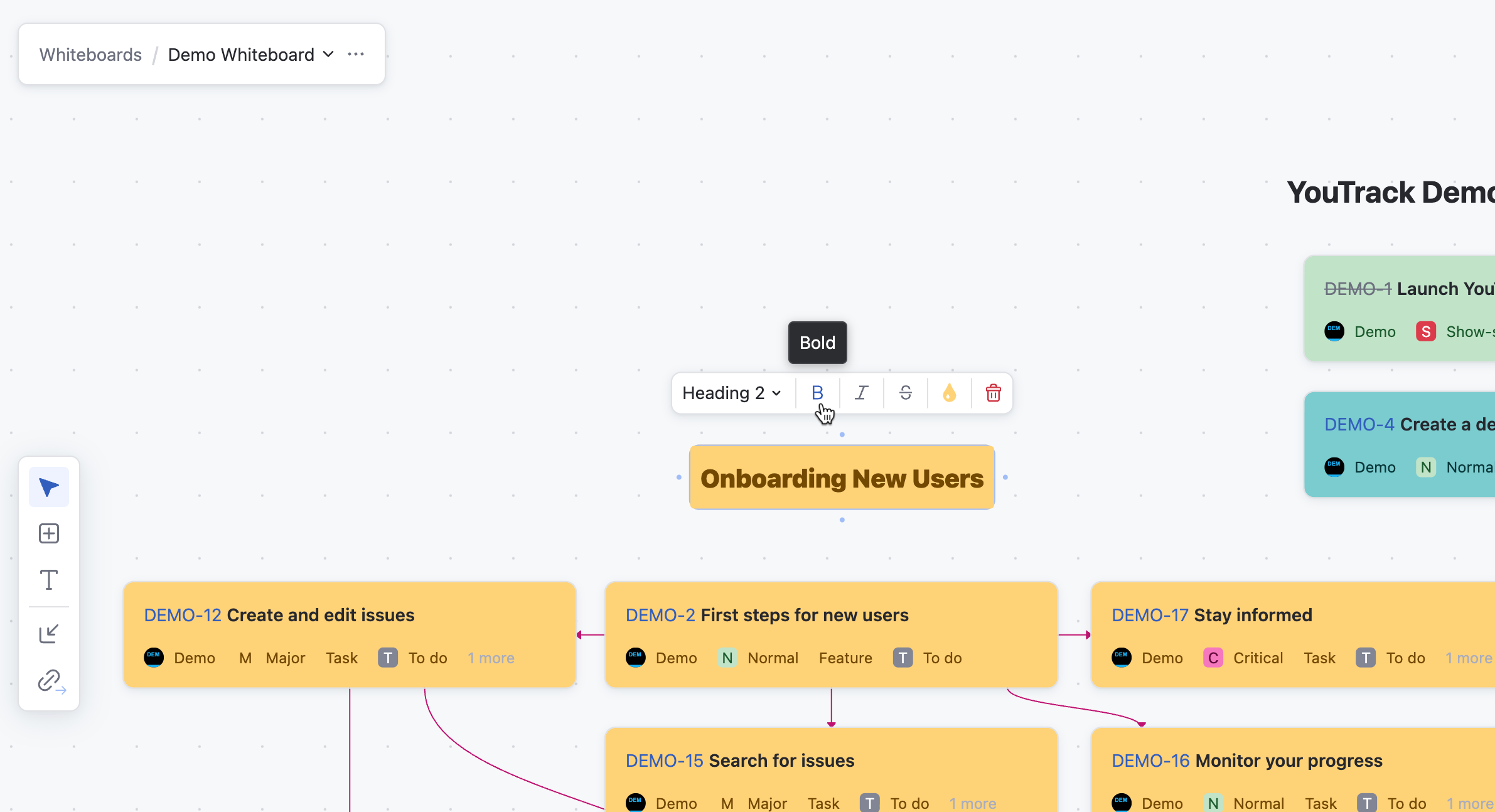 A New text block on the whiteboard is a borderless space for adding context, labels, or organizing information. Text blocks cannot be converted into YouTrack issues or articles but can be linked to other elements to provide structure and clarity.