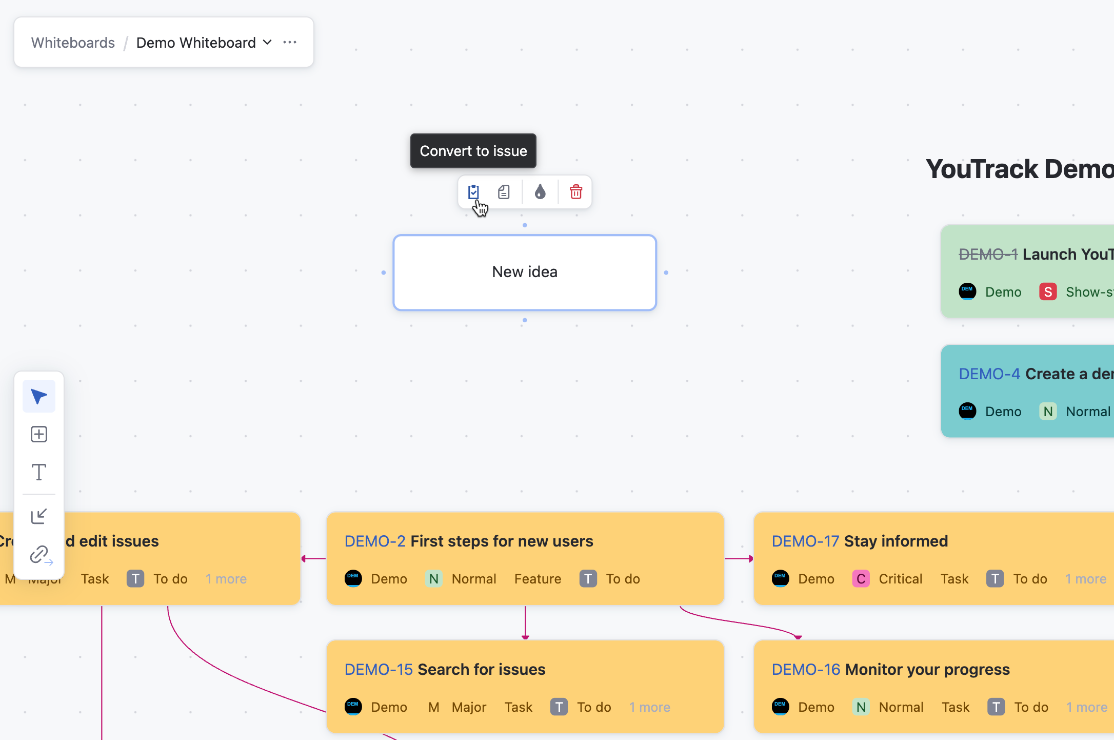 You can add existing issues and articles onto a whiteboard as cards. Additionally, you can convert text cards into issues or articles whenever needed, making it easy to turn ideas into actionable tasks or documentation.