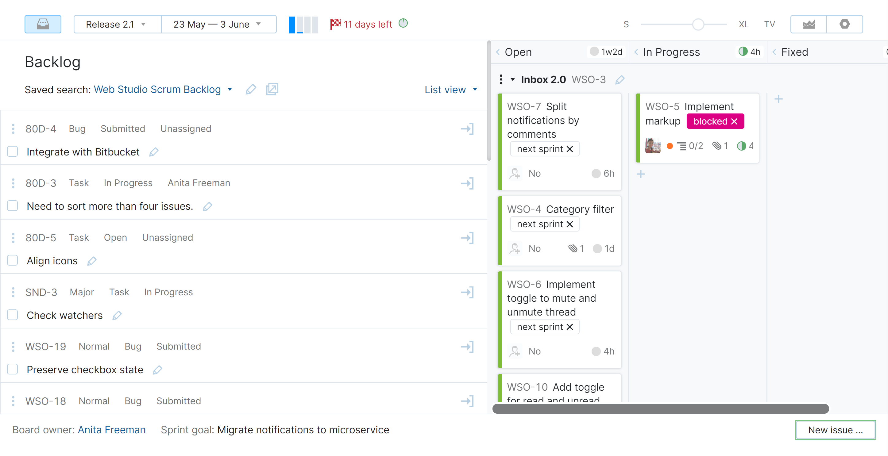 The list of issues that match the saved search that is used for the backlog is displayed in the Issues list.