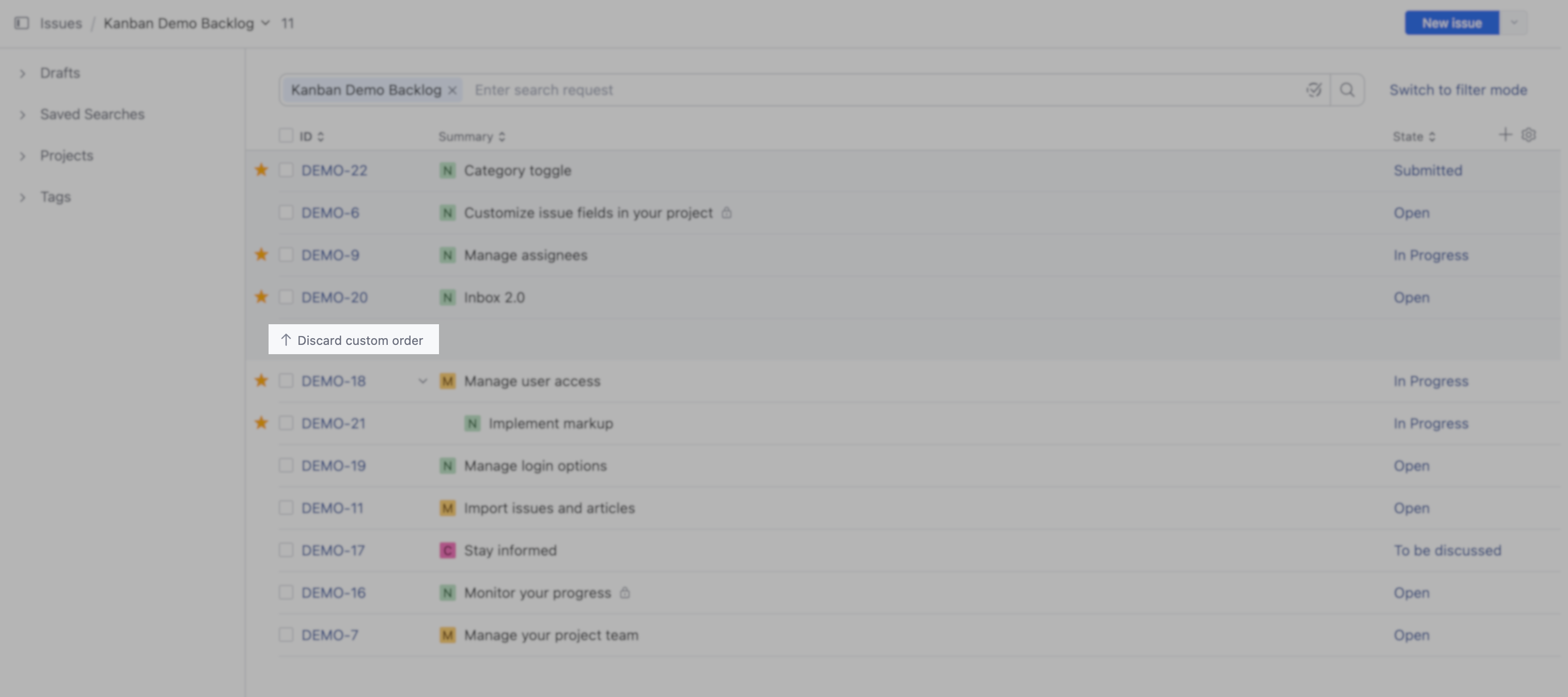 All issues reordered manually in the backlog to a saved search can be undone from the Issues list.
