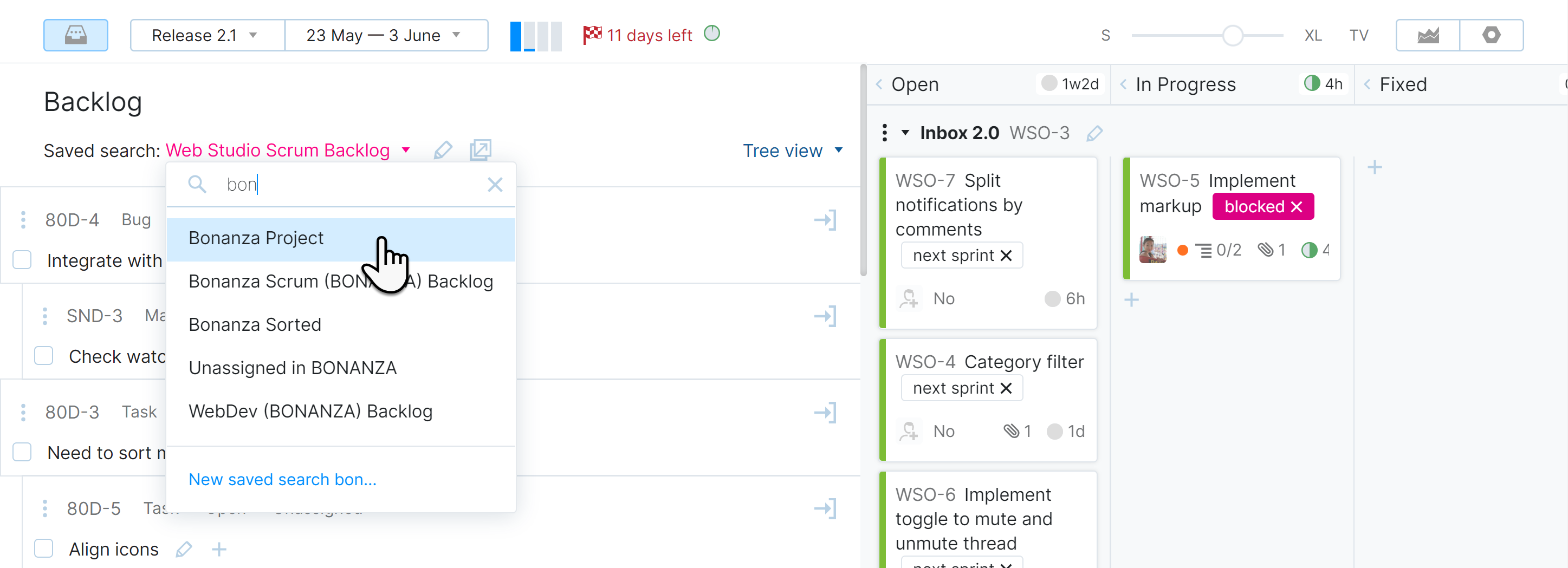 Click the name of the backlog and select any available saved search from the drop-down list.