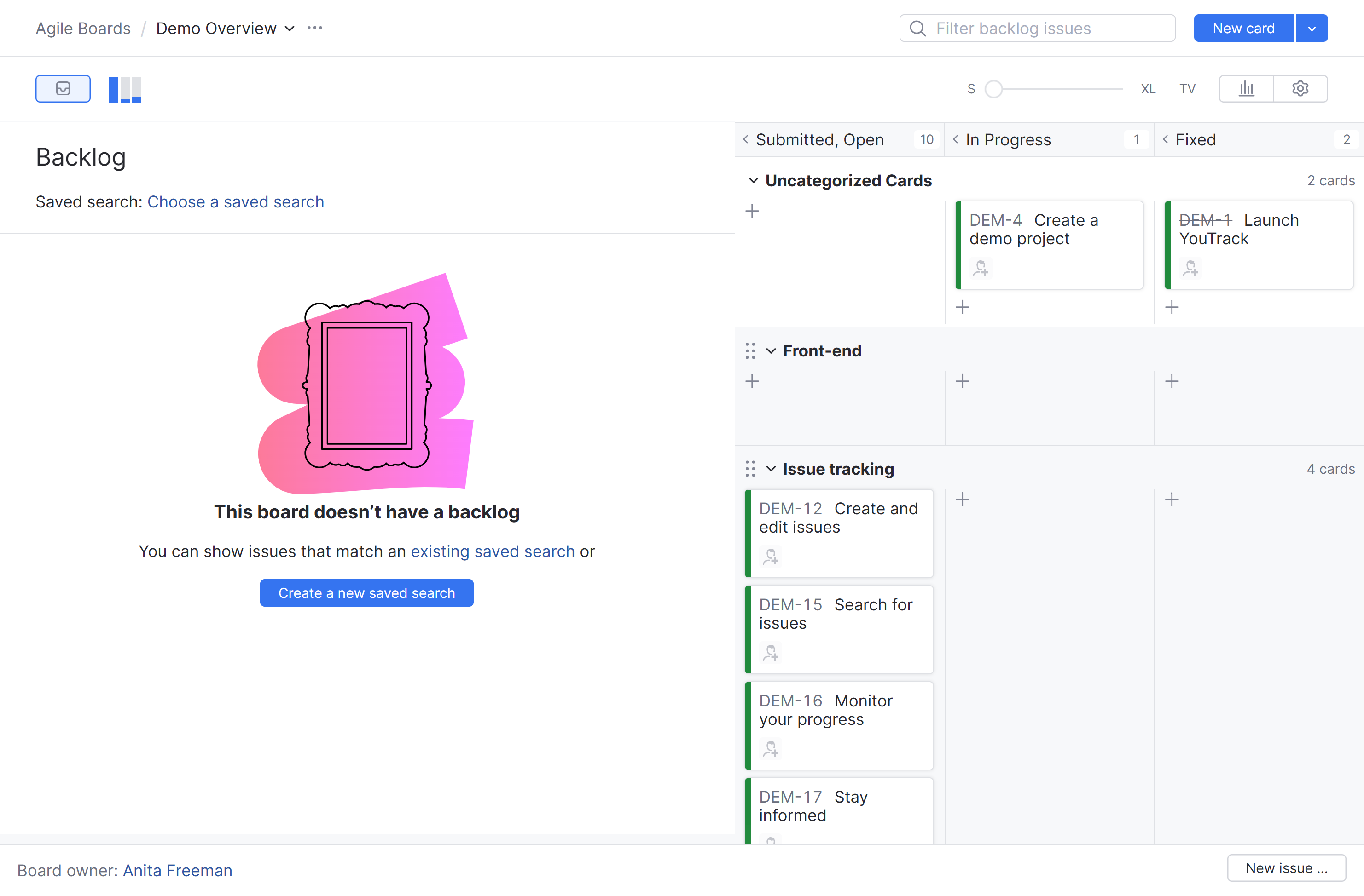 You can use any saved search available to you as a backlog for your board. This includes saved searches that you have created yourself or that are visible to a group you belong to as a member.