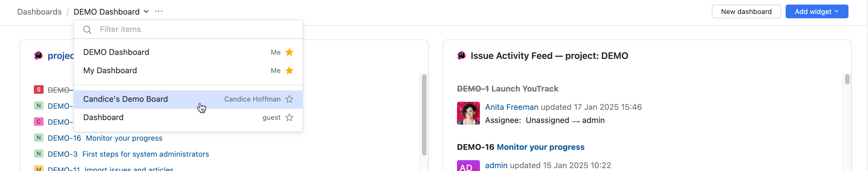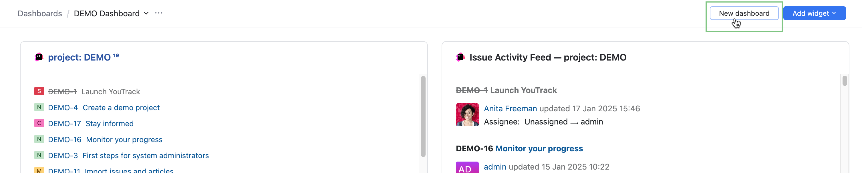 A dashboard displays widgets. The different widgets provide you with a quick view of data and insights for information in your YouTrack environment.