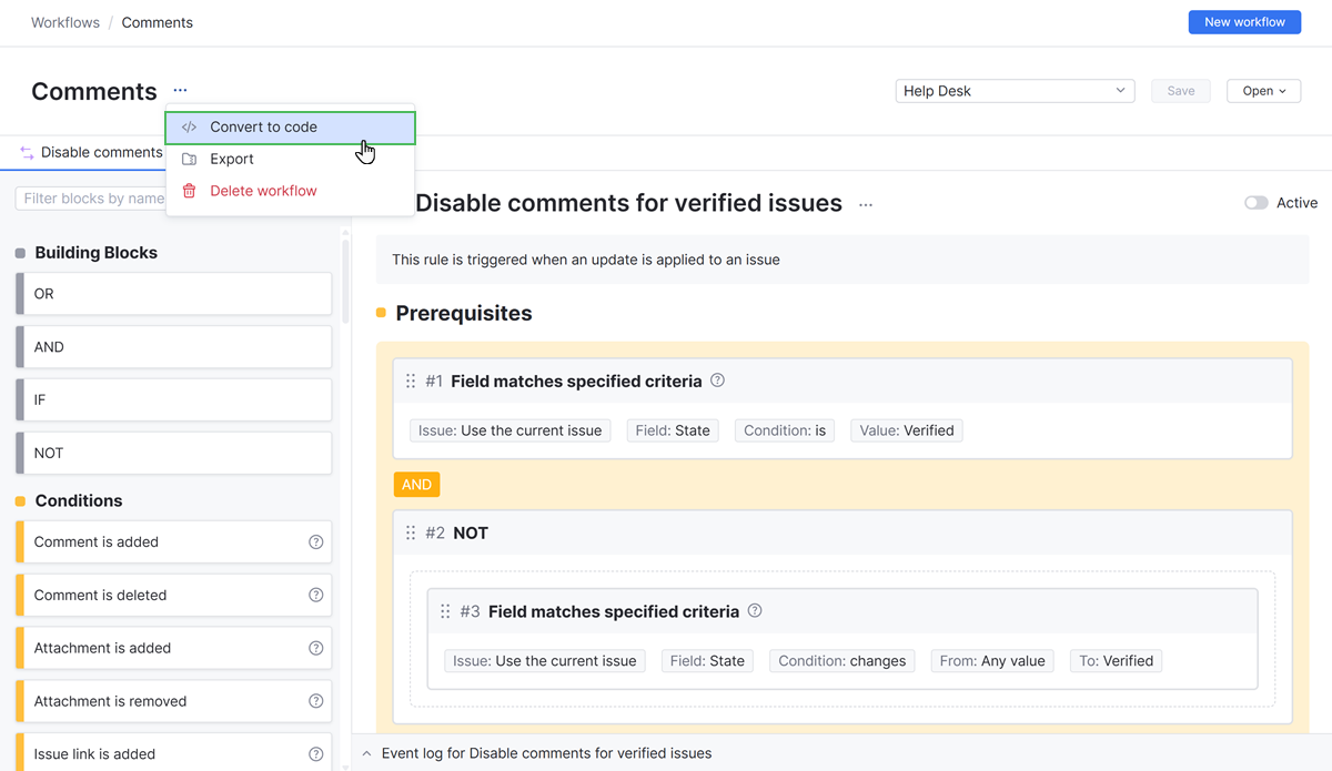 Select the Convert to code option in the Show more menu to transform the workflow into its JavaScript representation. This lets you apply changes to the workflow that aren't supported in the visual editor.