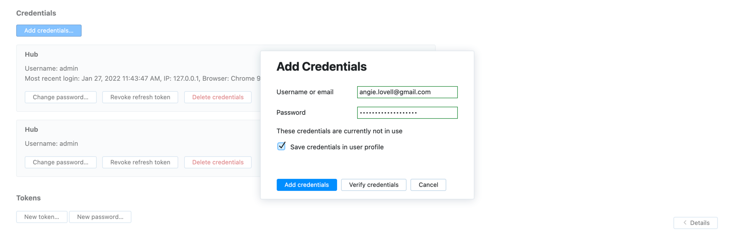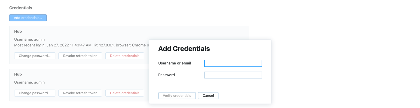 If no match is found, you have the option to add these credentials to your current profile as a new login. To add these credentials successfully, the password must meet the password strength requirement that is set for the Hub authentication module.
