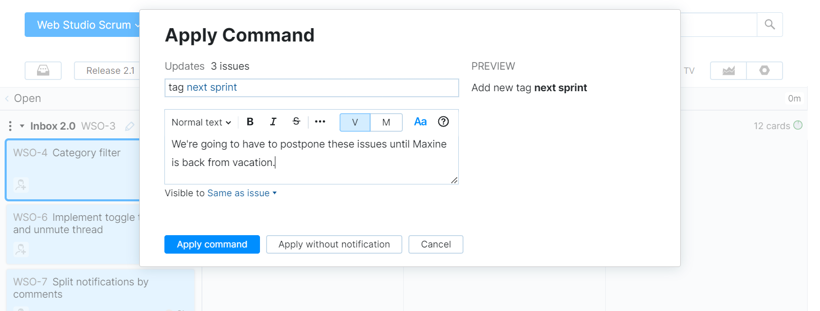 You can apply changes to multiple cards, for example, when you need to assign several tasks to the same assignee or set the same state. To do this quickly, use Space or Ctrl + click to select multiple cards and update them all at once. To enter the command, press Ctrl + Alt + J, or just start typing the command. When you start typing, the Apply Command dialog appears automatically.