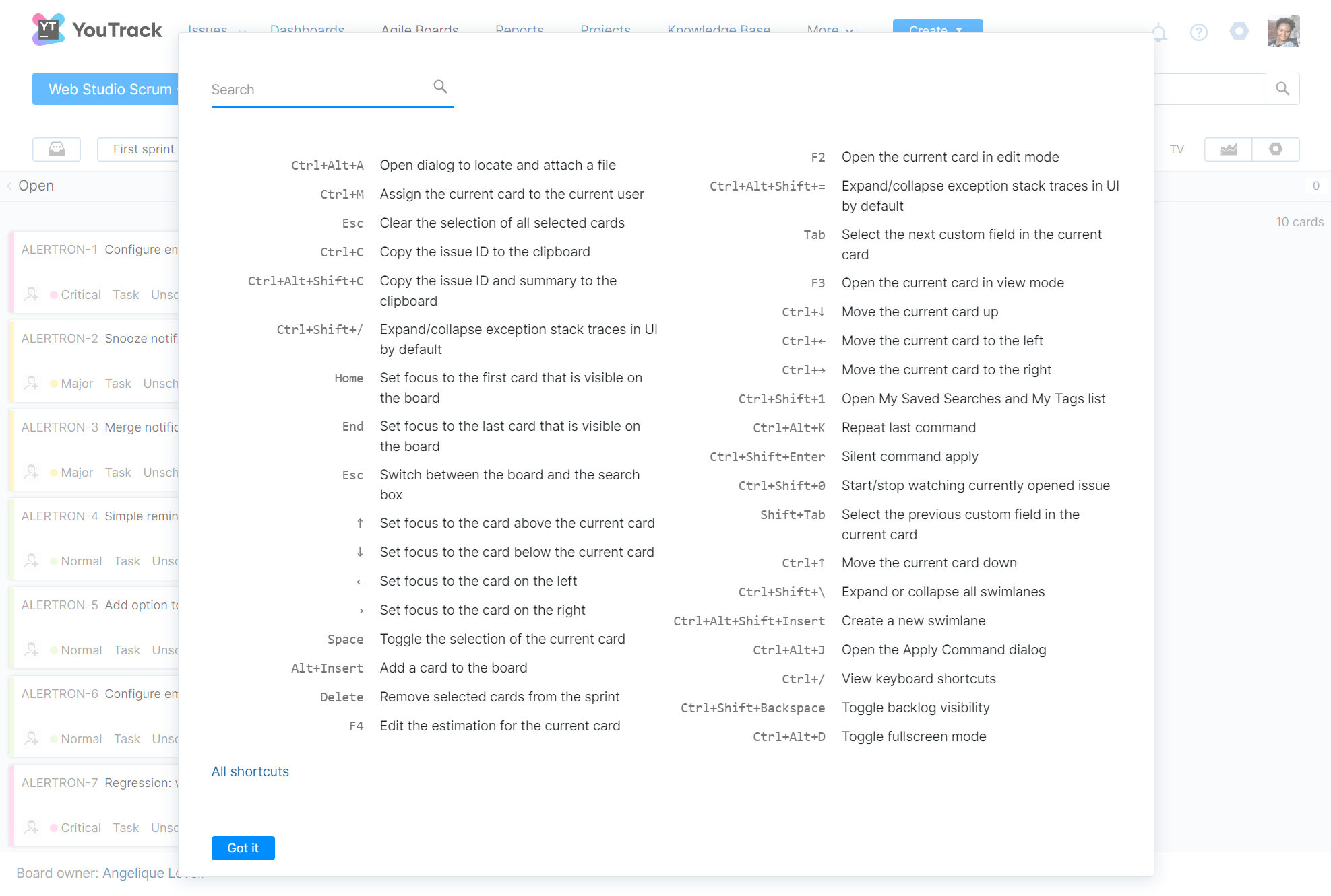 For a complete list, see Agile Board Keyboard Shortcuts.