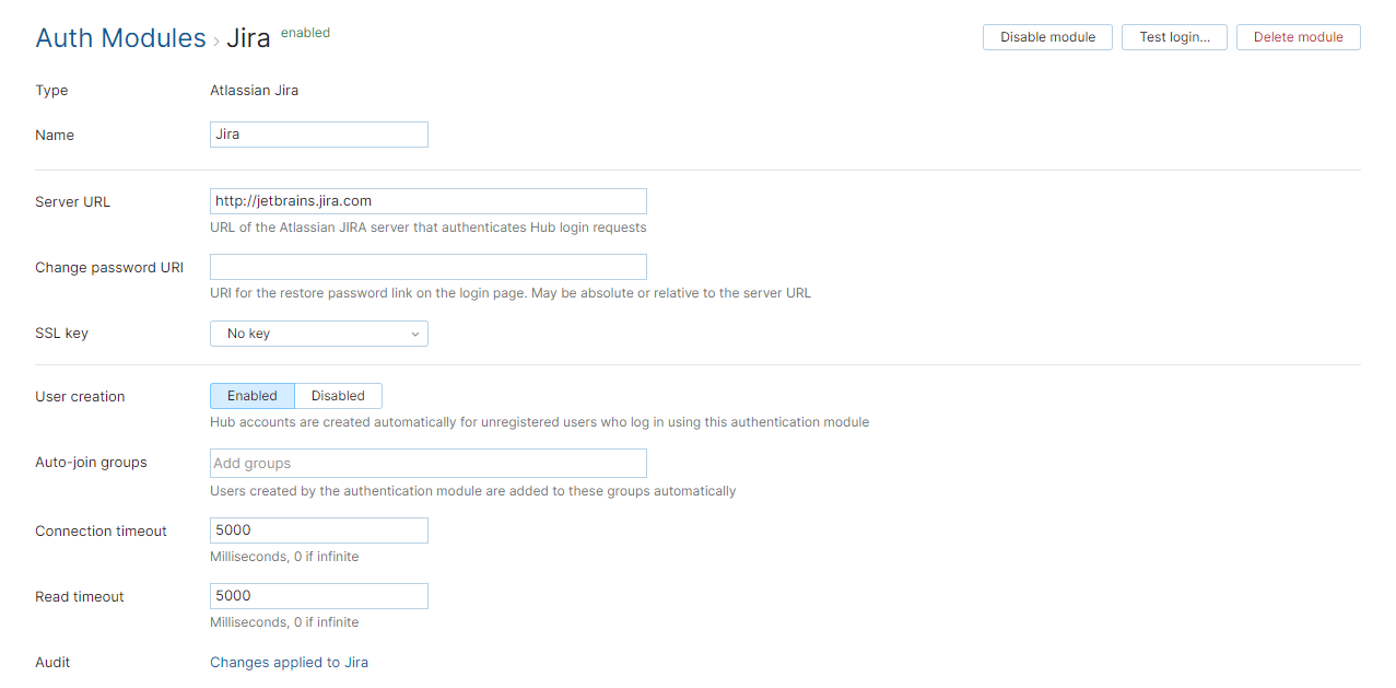 Audit | Links to the Audit Events page in YouTrack. There, you can view a list of changes that were applied to this authentication module. |
